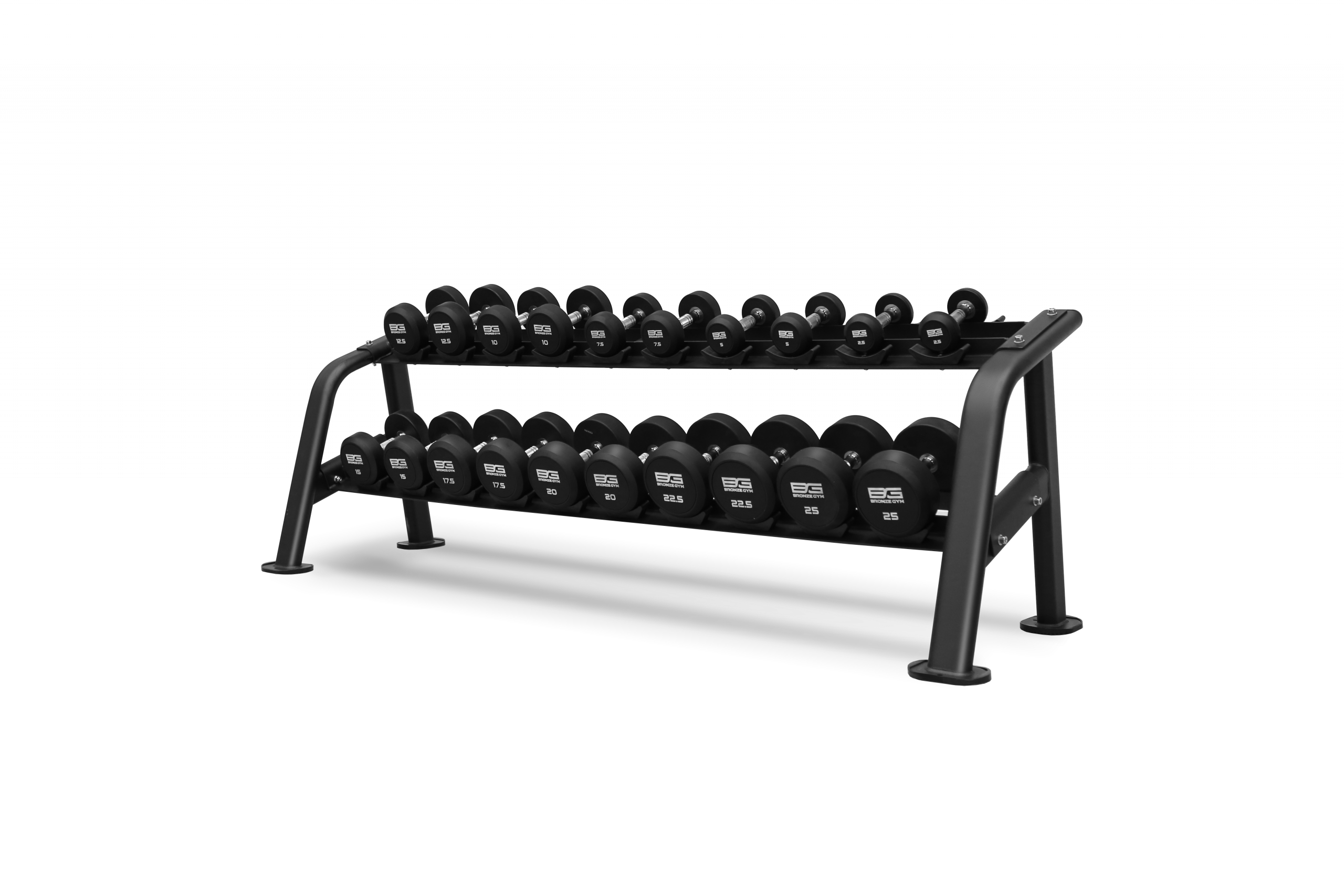 Профессиональные гантели от BRONZE GYM имеют обрезиненную поверхность, которая предотвращает повреждение стоек под гантели, напольного покрытия и другого тренировочного оборудования.