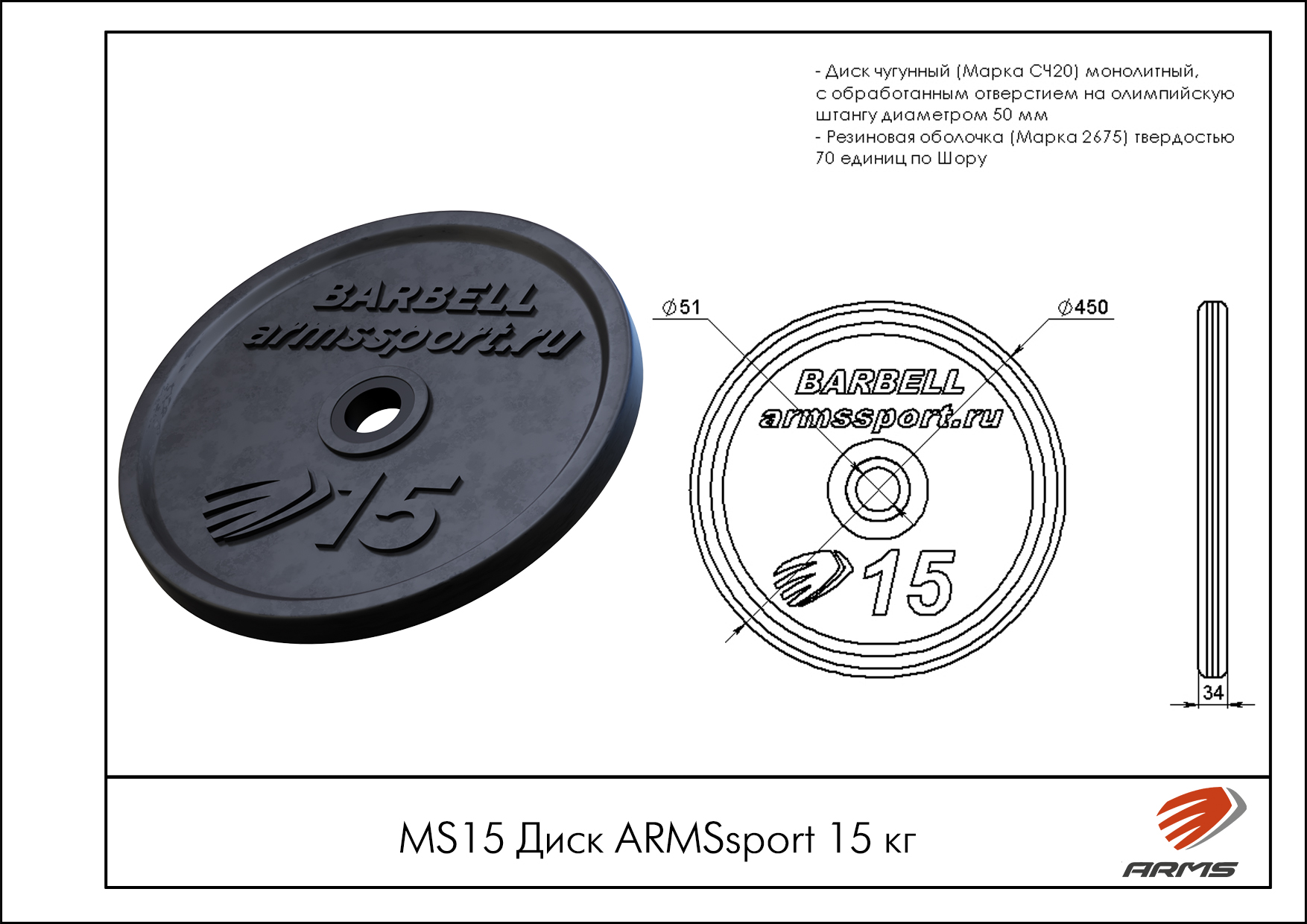 Диск Олимпийский ARMSsport 15 кг Barbell ЕВРО-КЛАССИК
