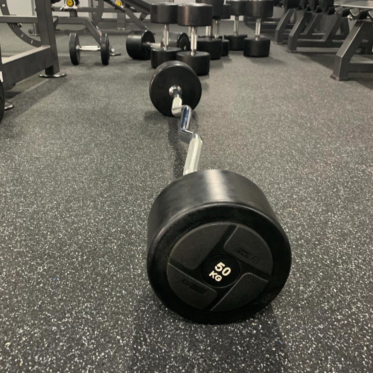 Изогнутый гриф, утяжеление выполнено из черных монолитных обрезиненных дисков, Покрытие грифов- зеркальный хром с противоскользящей насечкой. Гриф штанги со специальными