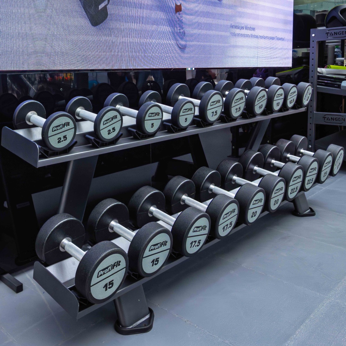 Стойка E7077 предназначена для удобного хранения круглых гантелей, например, гантельных рядов PROFESSIONAL и POWER. Основа выполнена из сверхпрочного металлического овального