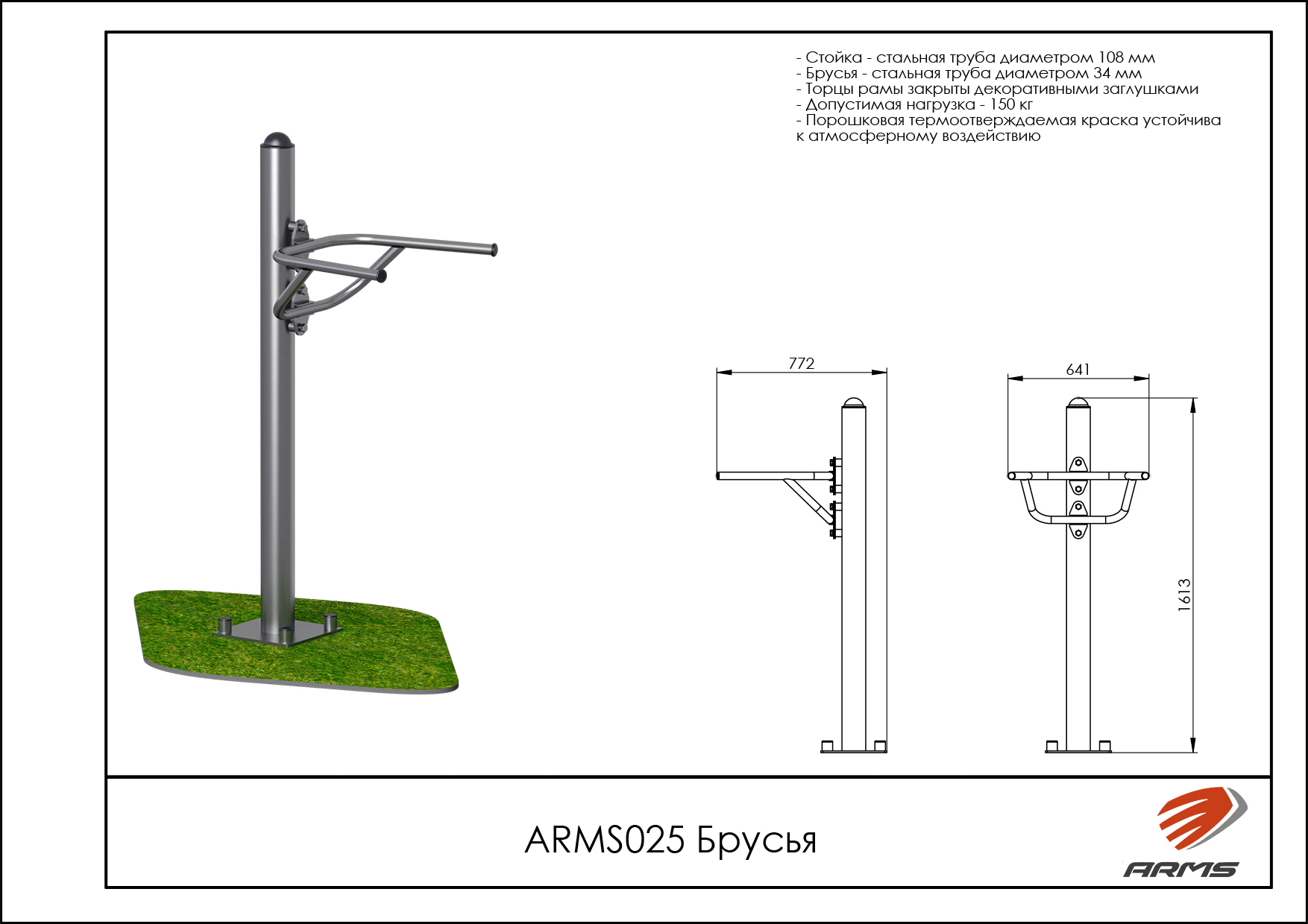 Комплектующий элемент серии уличных тренажёров WORKOUT пресс-брусья ZAVODSPORTA* для создания индивидуального спортивного комплекса. Основание подлокотников выполнено из металлической трубы диаметром