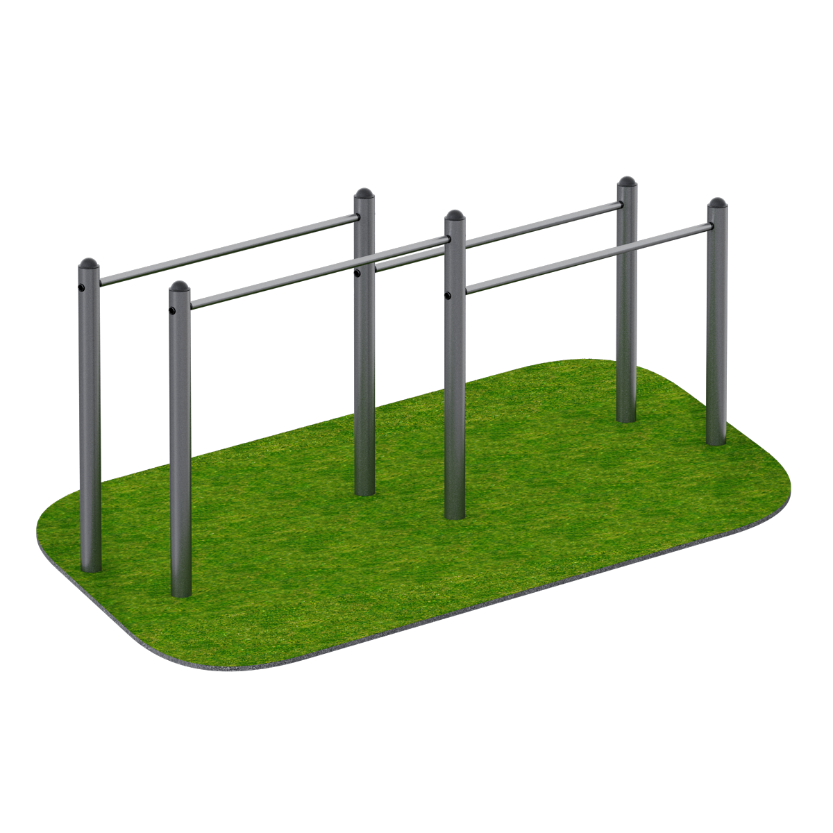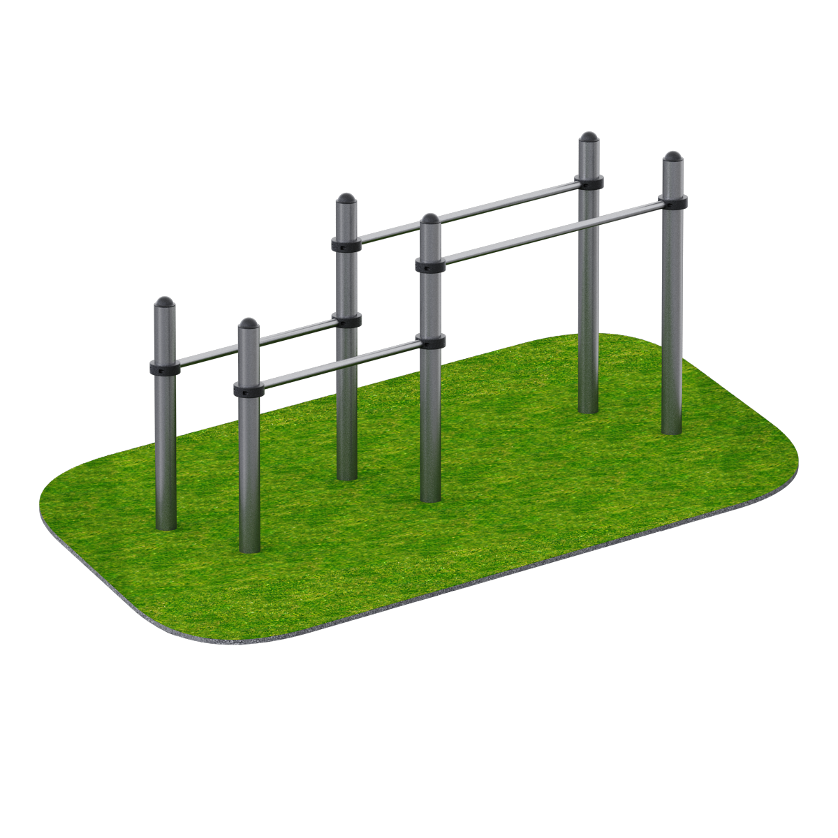 Уличные двойные разноуровневые брусья для отжиманий ZAVODSPORTA* предназначены для установки на уличных спортивных площадках с учетом интенсивной эксплуатации в разных