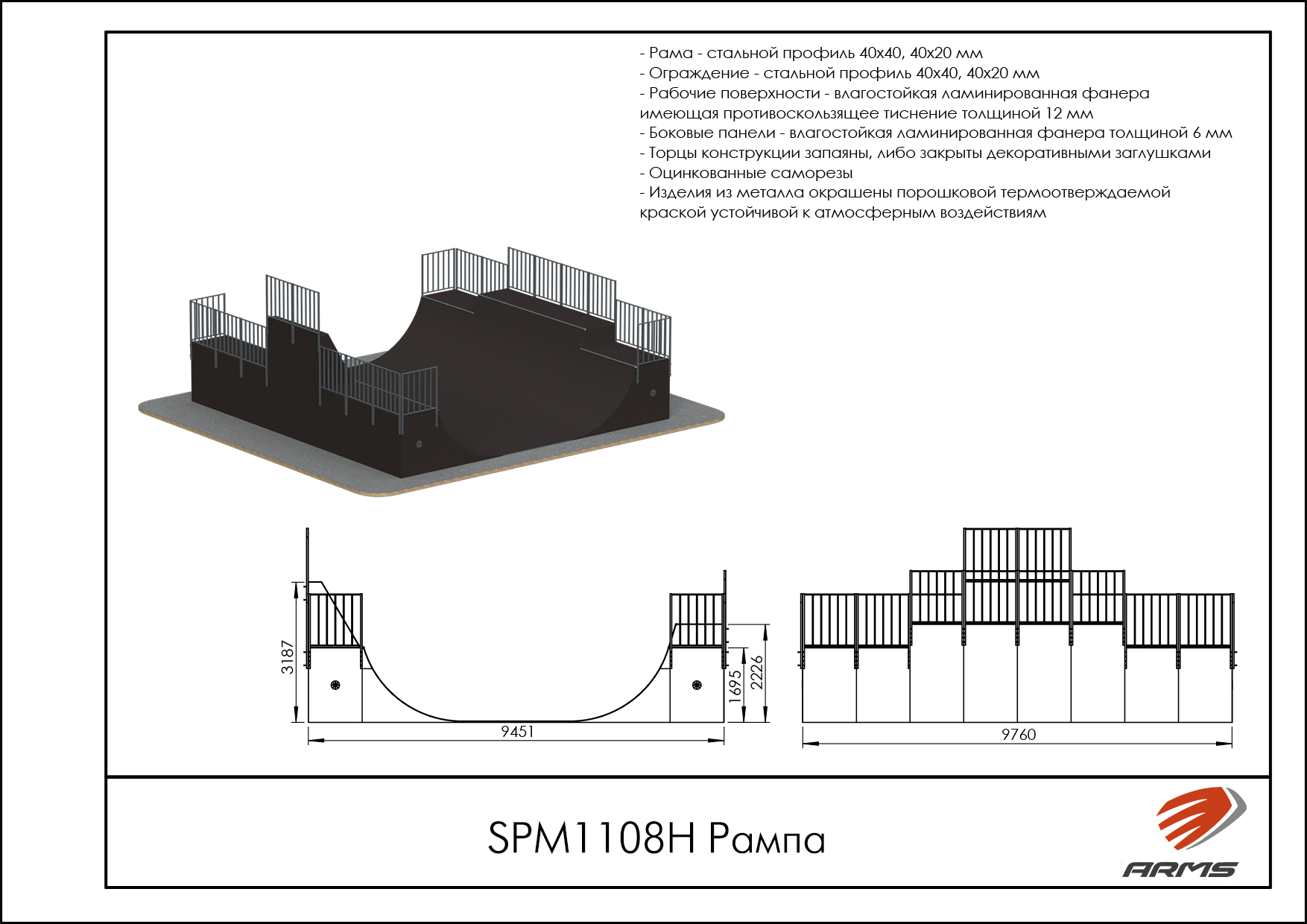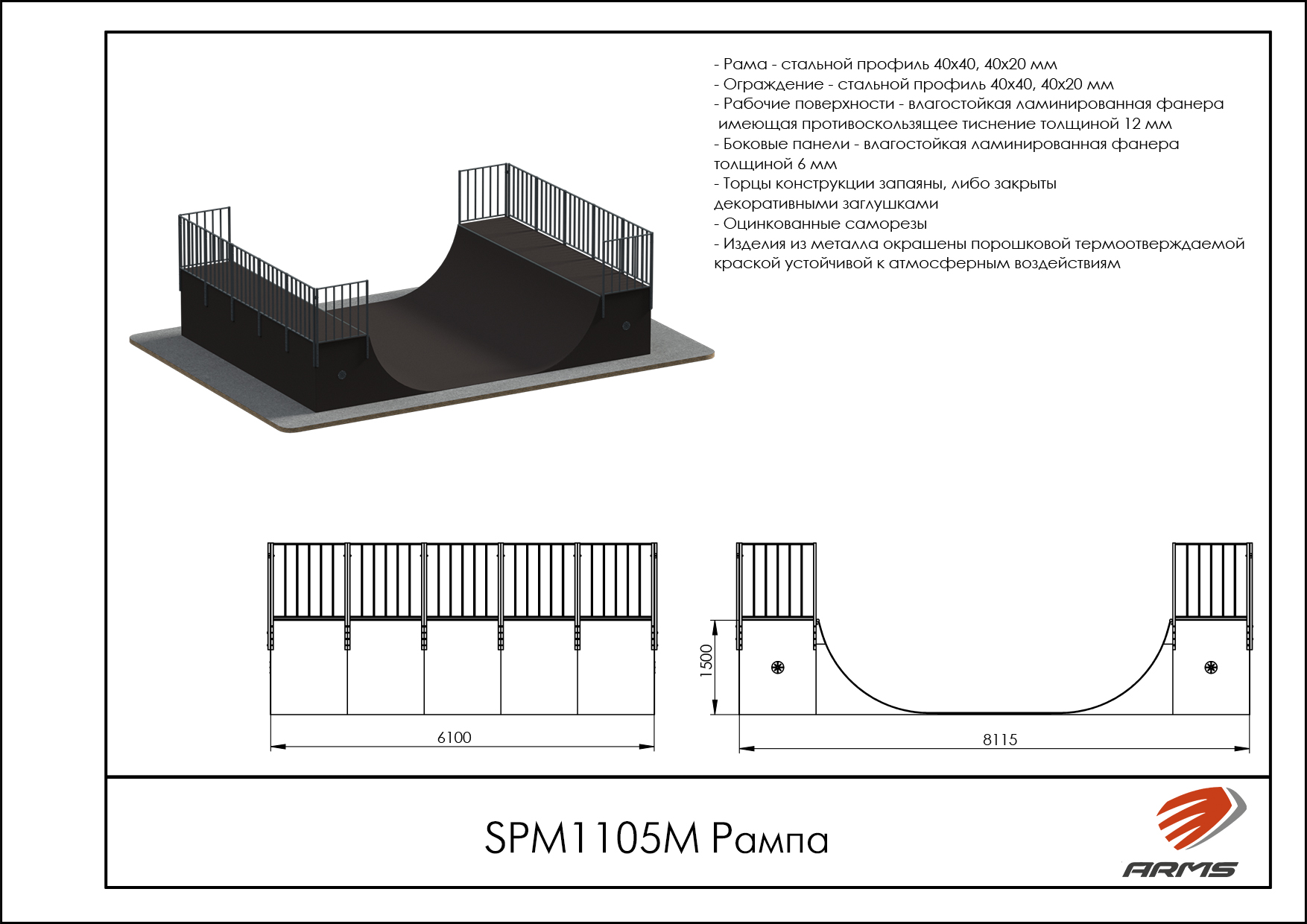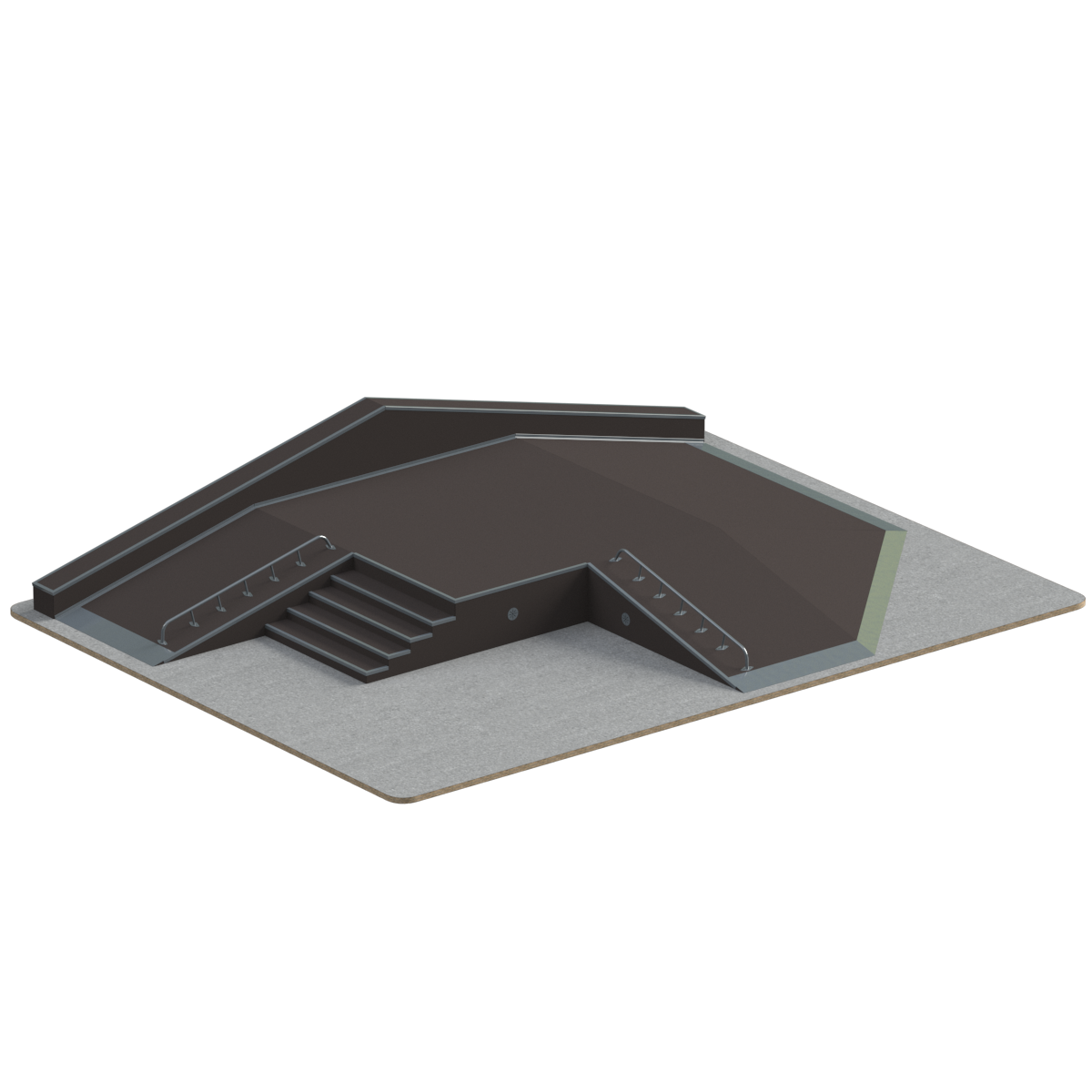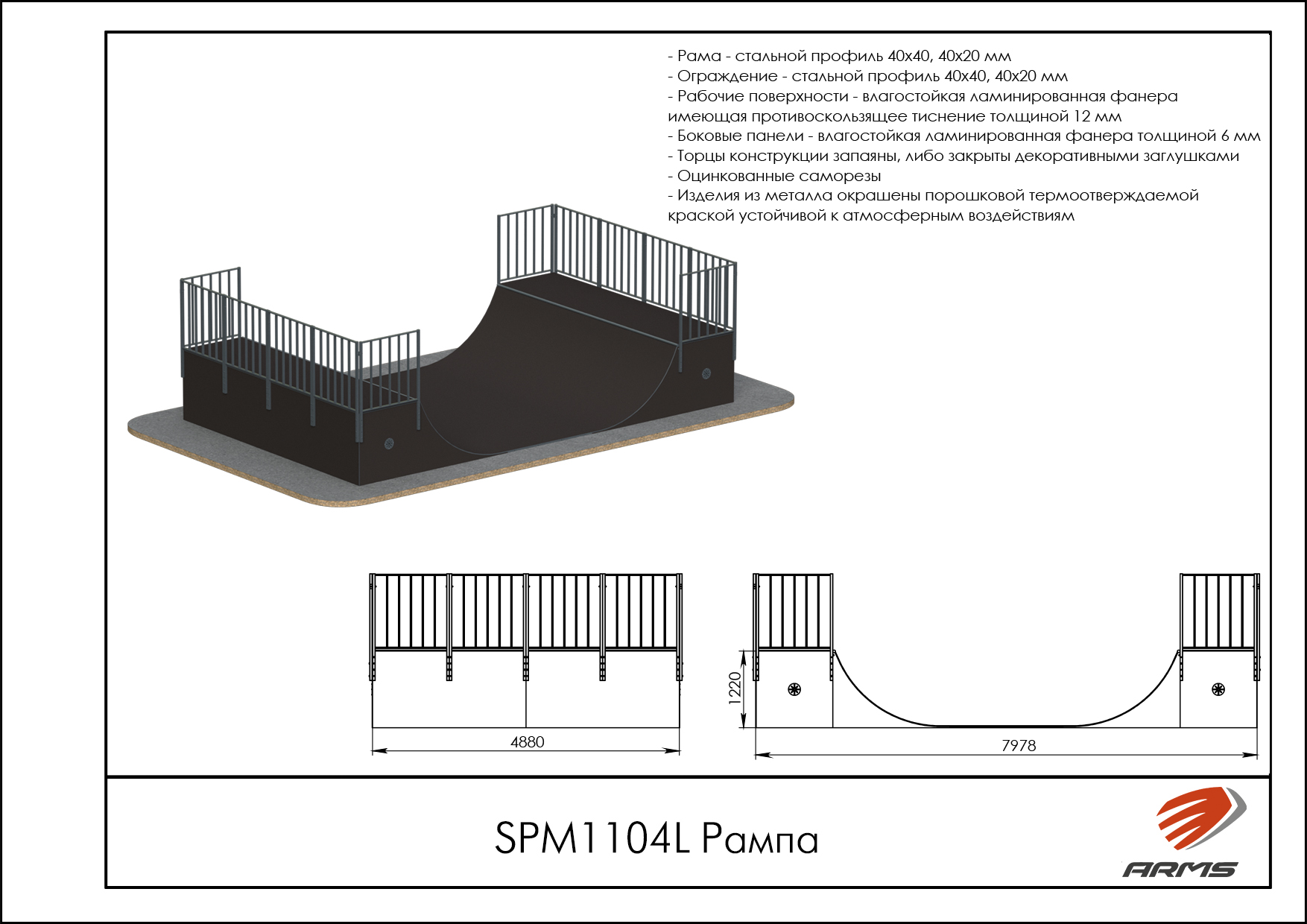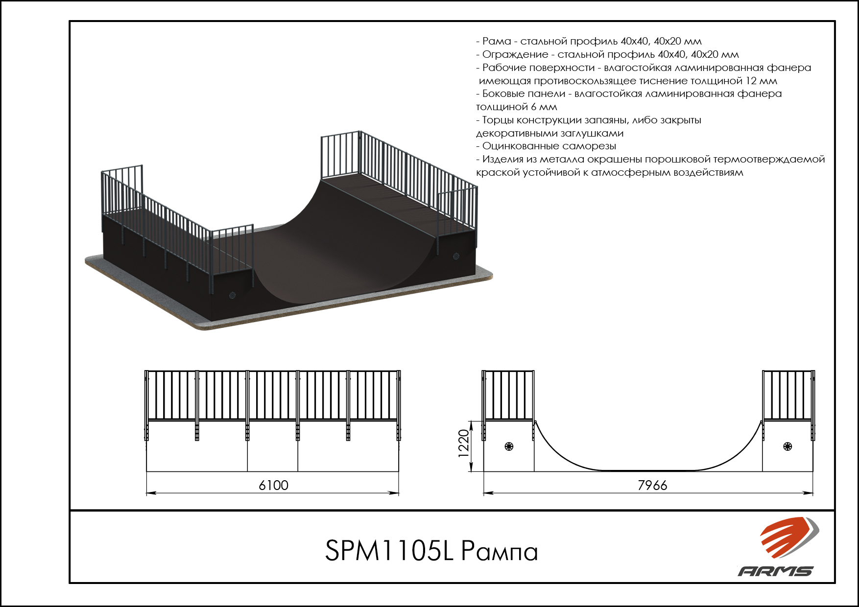 Предназначение: Рампа двухуровневая, по-другому Халф-пайп, представляет собой сложную конструкцию из двух радиусов, повернутых друг к другу с различной высотой подъема