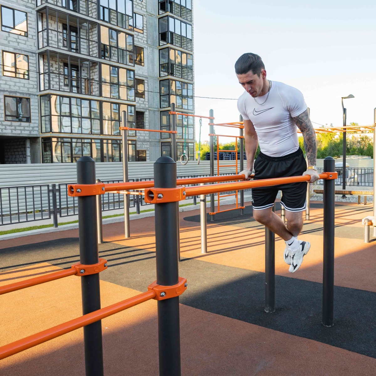 Уличные двойные разноуровневые брусья для отжиманий ZAVODSPORTA* предназначены для установки на уличных спортивных площадках с учетом интенсивной эксплуатации в разных