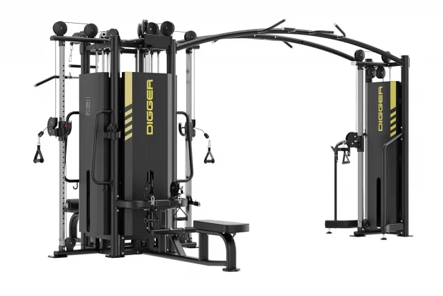 Многофункциональный тренажер профессионального класса предназначен для результативной проработки мышц всего тела. Тренажер объединяет в себе 5 станций, в том числе одну станцию для тяги сверху, одну станцию для гребной тяги, станцию для жима ногами и две кабельные колонны, что позволяет одновременно тренироваться до пяти пользователей. Нагрузка с постоянным сопротивлением обеспечивает высокую эффективность тренировок. Прочное рамное основание, на базе которого создан тренажер, изготовлено из усиленного стального профиля. За счет минимального использования сварных швов при изготовлении рамы обеспечивается усиленная жесткость и надежность рамной конструкции. Конструкция тренажера включает 5 грузовых стеков весом по 100 кг каждый. Каждый стек включает по 20 весовых плит. Передача нагрузки осуществляется с помощью тросово-блочной системы, в которой используется прочный трос толщиной 5 мм. Легкий выбор нагрузки легко осуществляется из рабочего положения. Для выбора нагрузки используется магнитный фиксатор. Станции для тросовой тяги включают в свою конструкцию профилированный стержень с блоками, которые регулируются по высоте для выполнения верхней, нижней и средней тяги. В комплектацию тренажера входят вращающиеся ручки и анатомические рукоятки для тяг. Все рукоятки покрыты нескользящим материалом, что обеспечивает надежность хвата. Станции для тяги сверху, гребной тяги и жима ногами оборудованы эргономичными сиденьями, которые обеспечивают правильную посадку для эффективного выполнения целевых упражнений. Простые регулировки позволяют каждому пользователю выполнить соответствующие настройки в соответствии со своими параметрами. За счет интуитивно понятных регулировок обеспечивается простота и легкость использования тренажера. Элементы регулировки выполнены из пластика яркого цвета, поэтому они хорошо заметны.