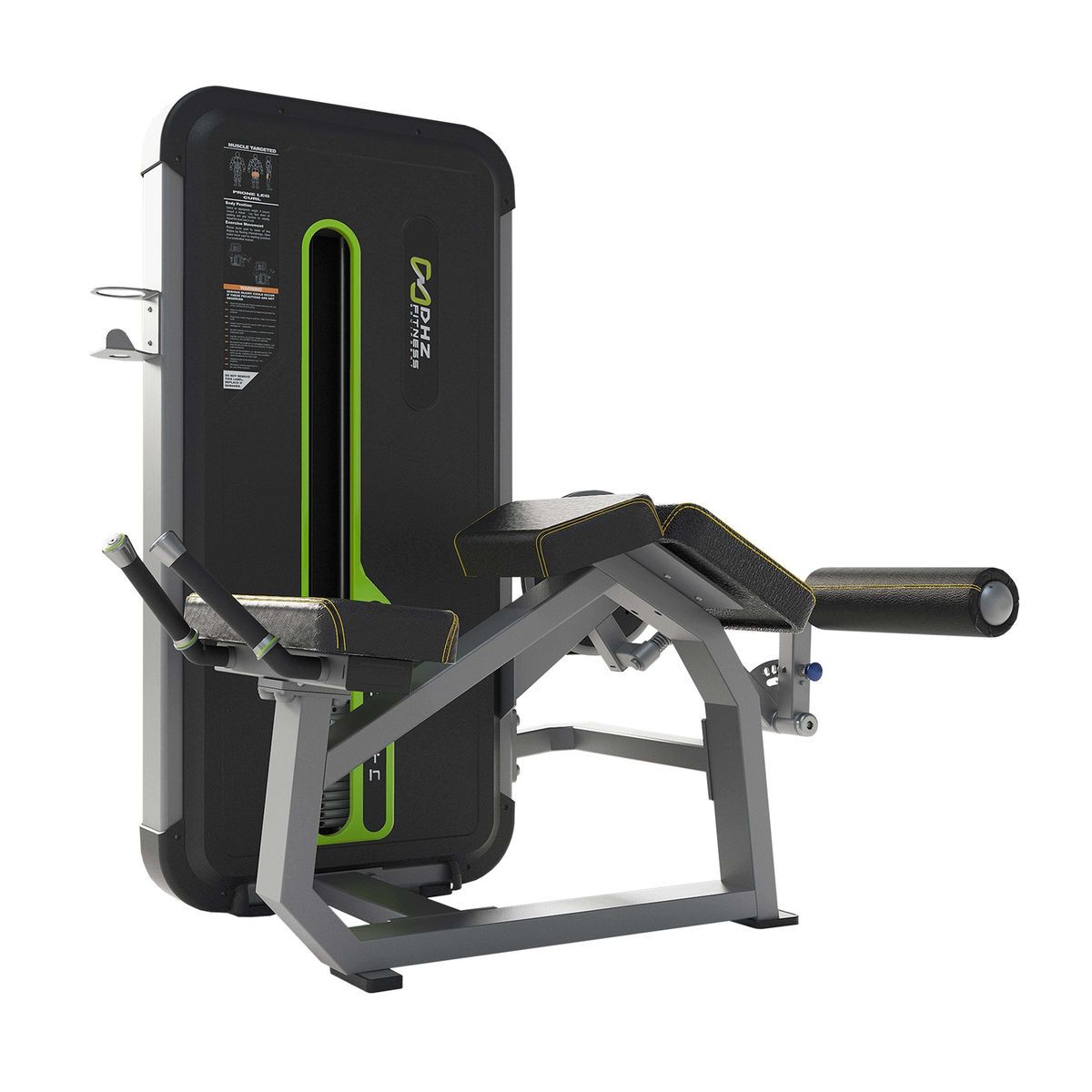 Удобный подход к тренажеру дает возможность пользователю выровнять положение коленных суставов с направляющей для более качественного выполнения упражнений. Роликовая подушка в области щиколоток оснащена рычагом, который позволяет регулировать ее в зависимости от длинны ног спортсмена. Тренажер предназначен для проработки задней поверхности бедра и работы с икроножными и шейными мышцами.