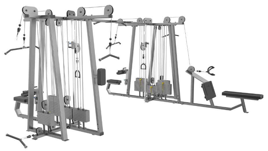 Многофункциональный комплекс A3064 RUS предназначен для спортивных залов с высокой и средней проходимостью. Общая система конструкции с улучшенной эргономикой для наиболее безопасных и эффективных тренировок человека, исходя из физических и физиологических особенностей человеческого организма, с контролем биомеханики упражнений. Универсальная конструкция, включающая 8 стеков по 100 кг и выполняющая функции 6 независимых тренажеров: тренажер для вертикальной тяги; тренажер для горизонтальной тяги; тренажер для развития и проработки трицепсов в положении стоя, тренажер для формирования дельтовидных и грудных мышц снабжен поворотными рукоятками, которые регулируются под длину рук пользователей