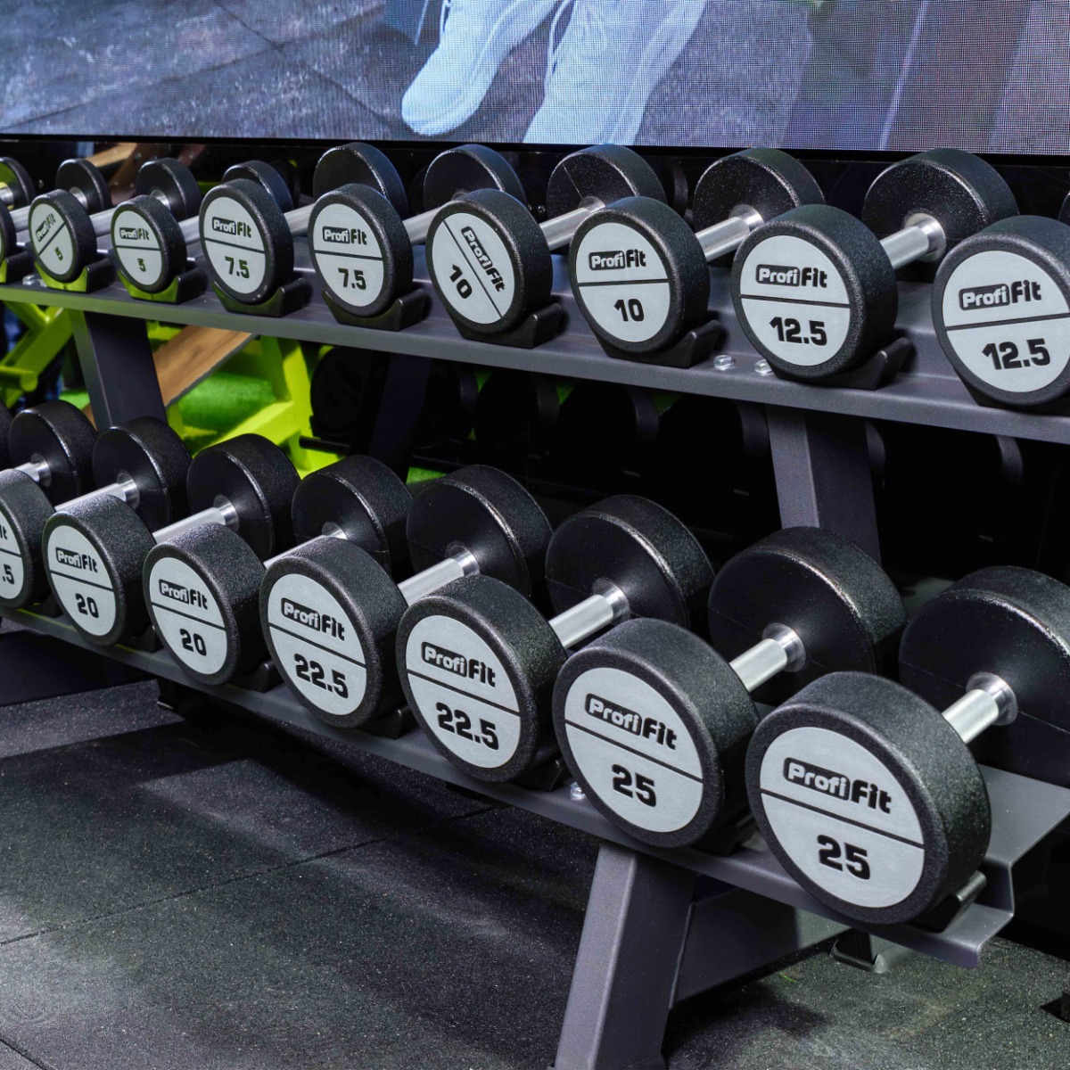 Профессиональная стойка для гантелей A3077 предназначена для хранения гантельных рядов серий PROFESSIONAL и POWER. Конструкция рассчитана на размещение десяти пар круглых гантелей с наружным диаметром дисков до 210 мм и общей нагрузкой до 720 кг. Обеспечивает компактное, безопасное и эргономичное хранение спортивного инвентаря.