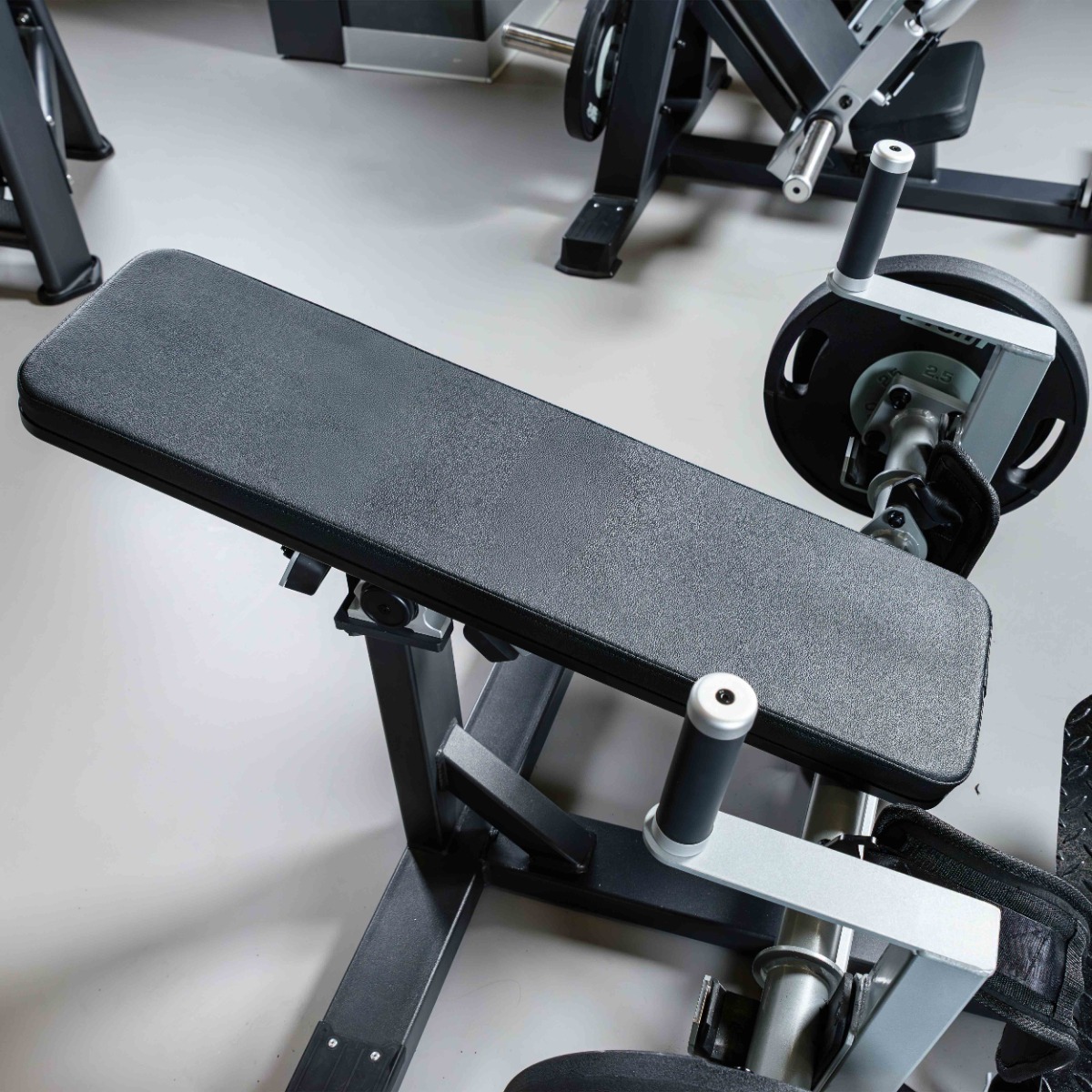 Рукоятки длиной 157 мм (рабочая длина 124 мм) для фиксации тела во время выполнения упражнения и ограничения хода подвижного рычага в верхнем положении выполнены из металлического прутка с нескользящим и неабсорбирующим влагу прорезиненным покрытием.