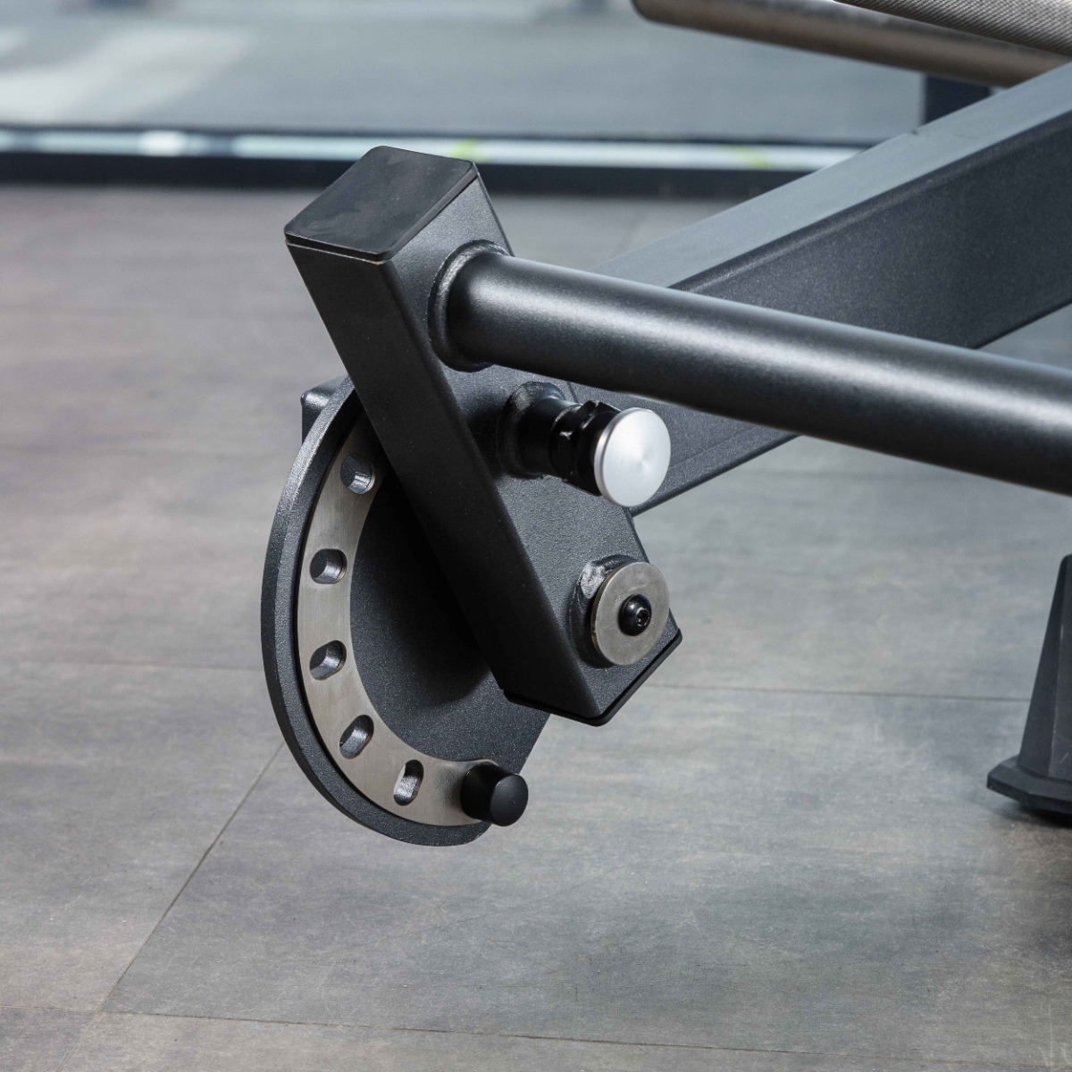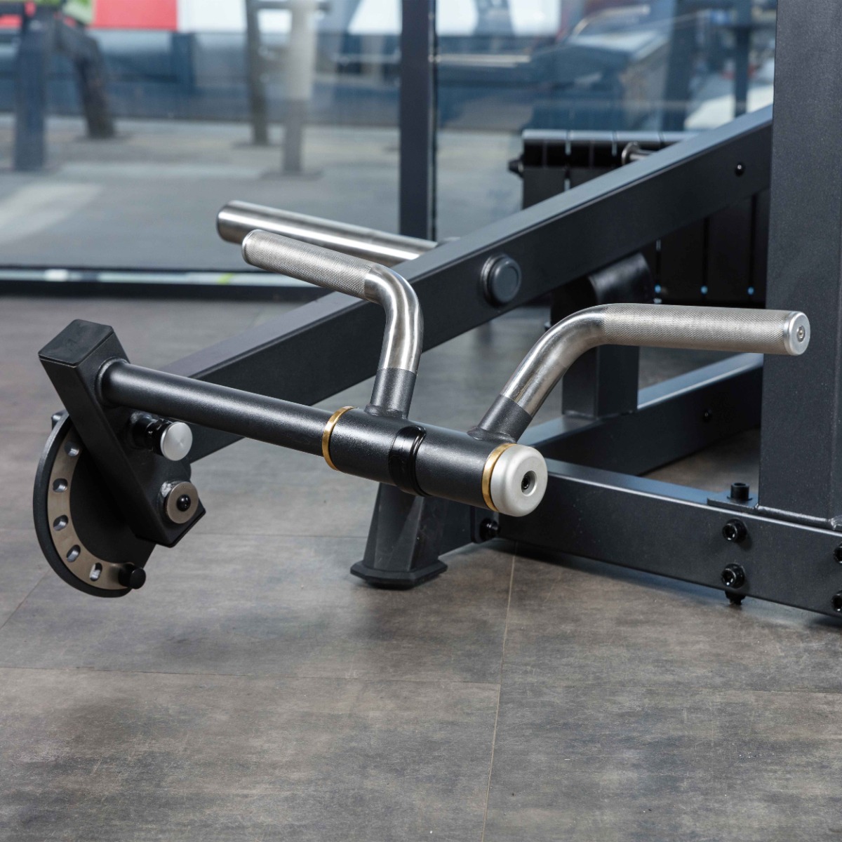 Рычаг снабжён двумя рукоятями V-образной формы, положение которых регулируется по дугообразной направляющей в шести фиксированных положениях. Дополнительно рукояти имеют ограниченное свободное движение по полукруглой траектории, что обеспечивает естественную биомеханику при выполнении упражнения.