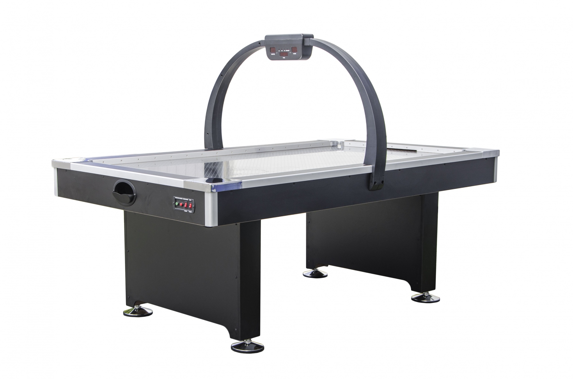 Оборудован электронным счетчиком очков с программированием времени матча и звуковой фиксацией забитой шайбы. Для того, чтобы счет матча постоянно находился в поле зрения игроков, счетчик очков установлен на раму над игровым полем.