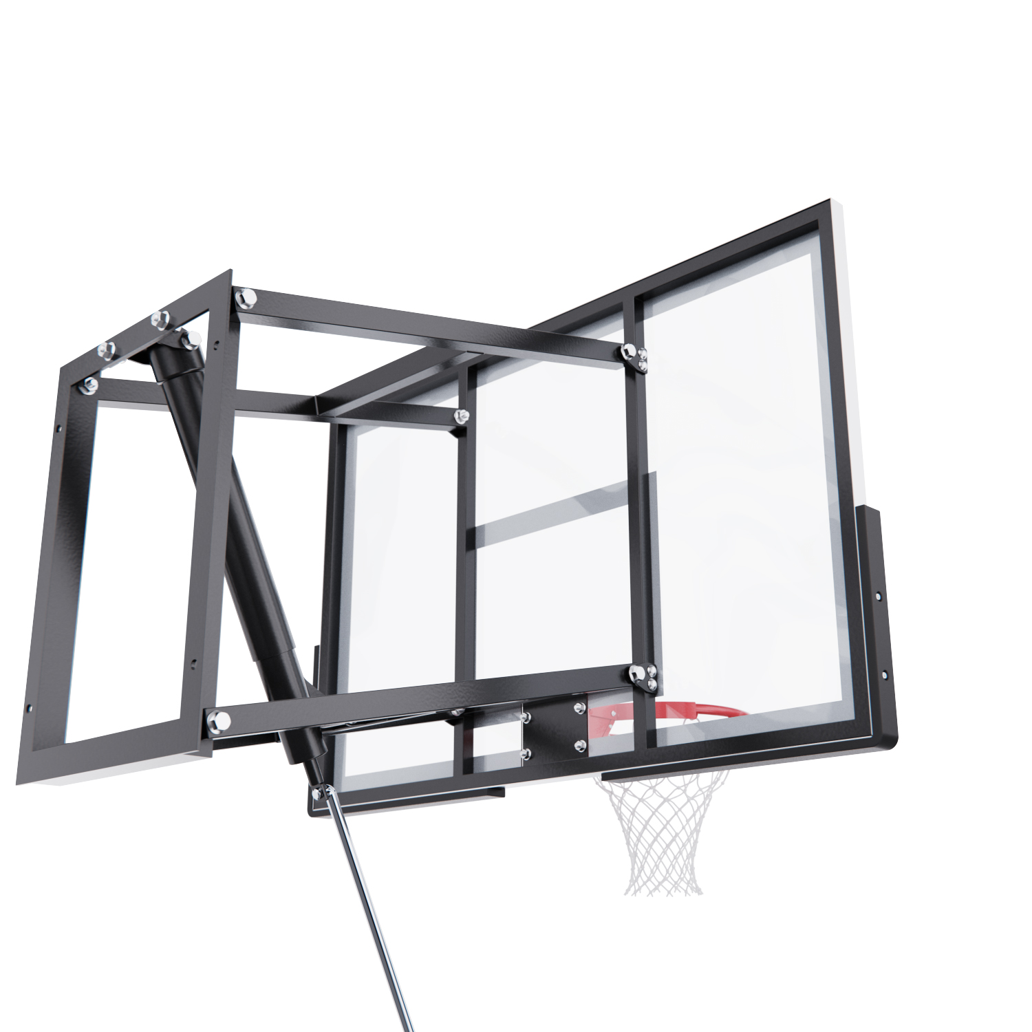 Щит изготовлен из прочного поликарбоната толщиной 2,5 мм — материала, обеспечивающего хороший отскок мяча и устойчивость к ударам. Его размеры — 120 x 80 см, что делает его максимально приближенным к профессиональному оборудованию. Регулируемый вынос щита (51–55,5 см) повышает безопасность и удобство во время игры. Дополнительную безопасность обеспечивает защита Poly Pade, установленная по нижнему краю щита.
