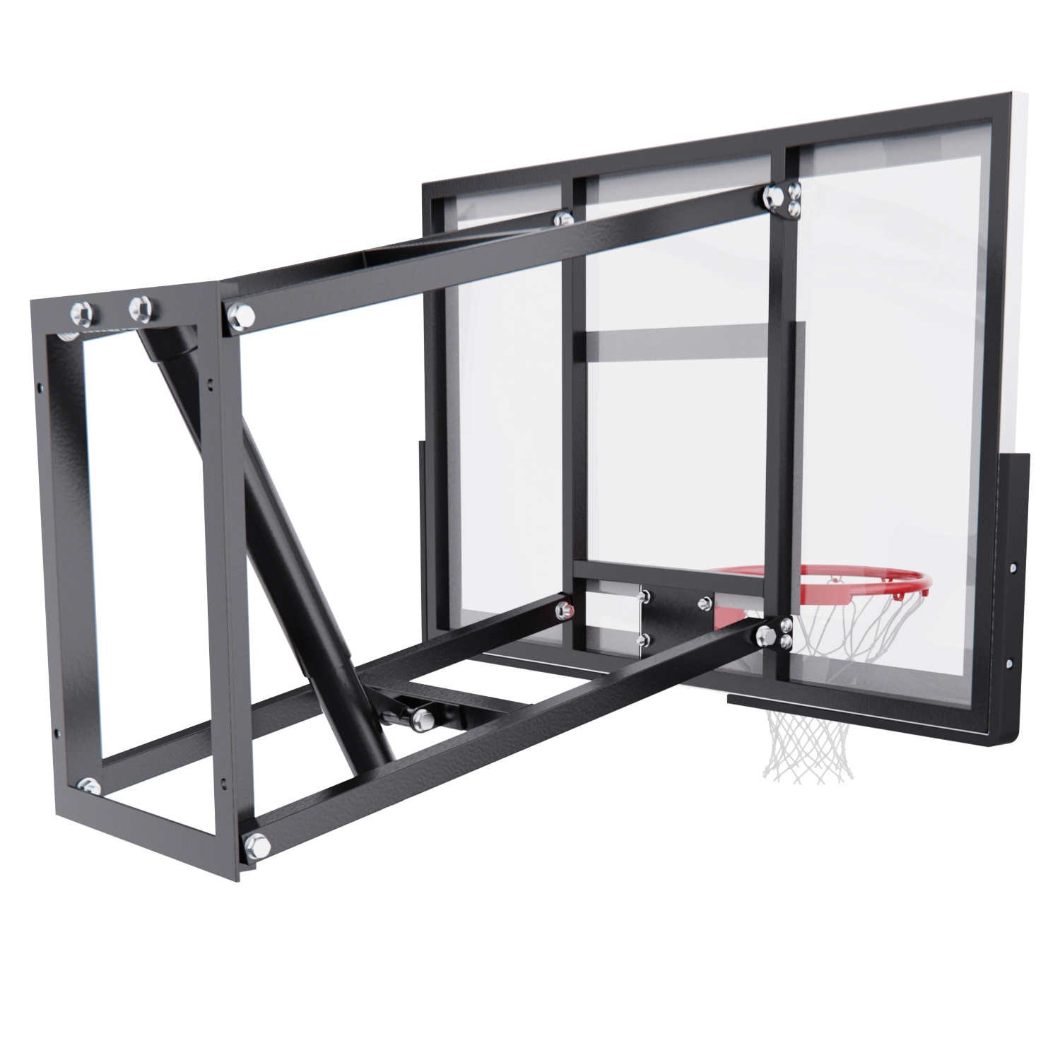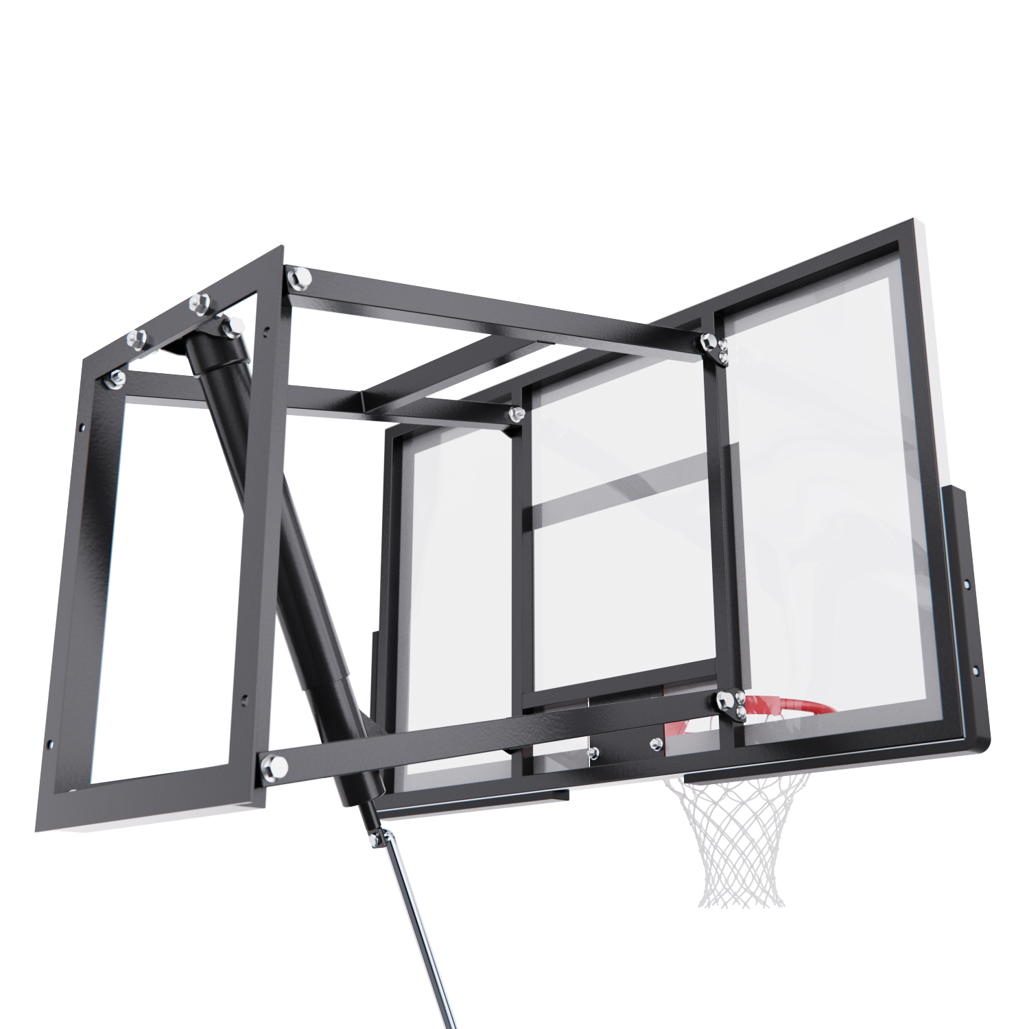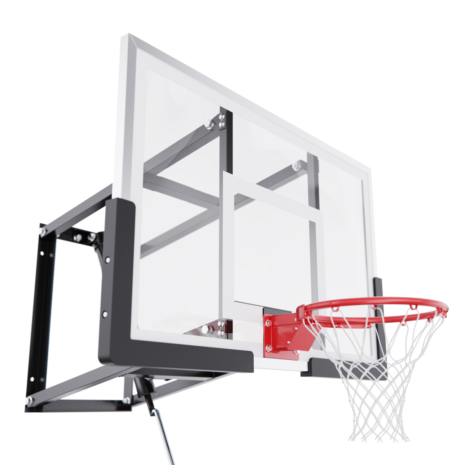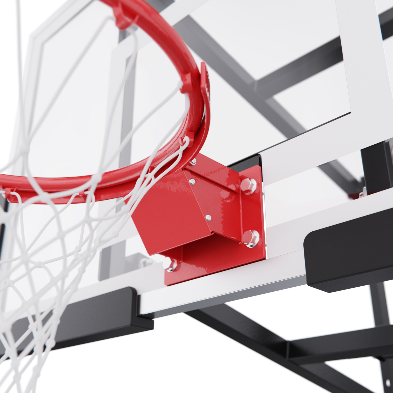 Щит изготовлен из прочного поликарбоната толщиной 2 мм — материала, обеспечивающего хороший отскок мяча и устойчивость к ударам. Его размеры — 110 x 70 см, что делает его максимально приближенным к профессиональному оборудованию. Регулируемый вынос щита (51–55,5 см) повышает безопасность и удобство во время игры. Дополнительную безопасность обеспечивает защита Poly Pade, установленная по нижнему краю щита.