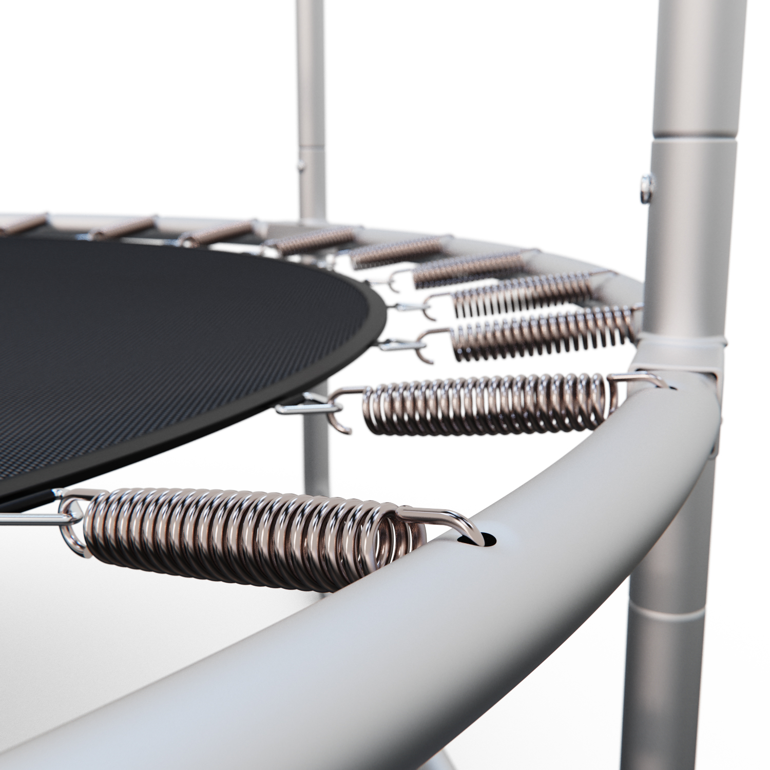 Батут оснащен 36-ю пружинами диаметром 2,5 мм и длиной 92 мм, которые обеспечивают мягкость и плавность прыжков. Кроме того, батут имеет прочный защитный кожух из полиэстера, который защищает прыгунов от травм и смягчает приземление.