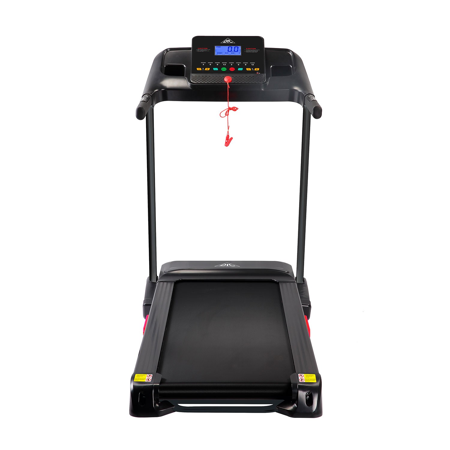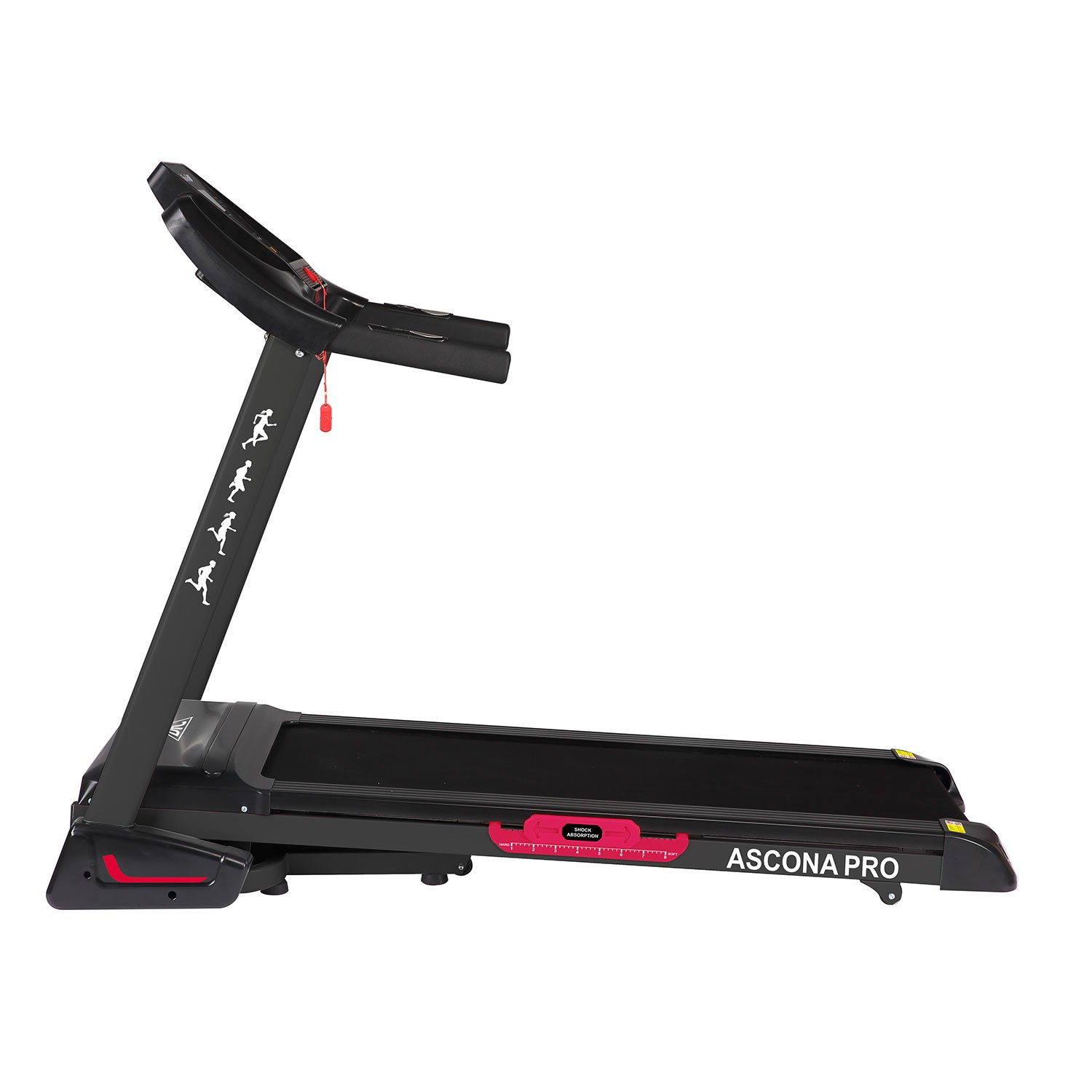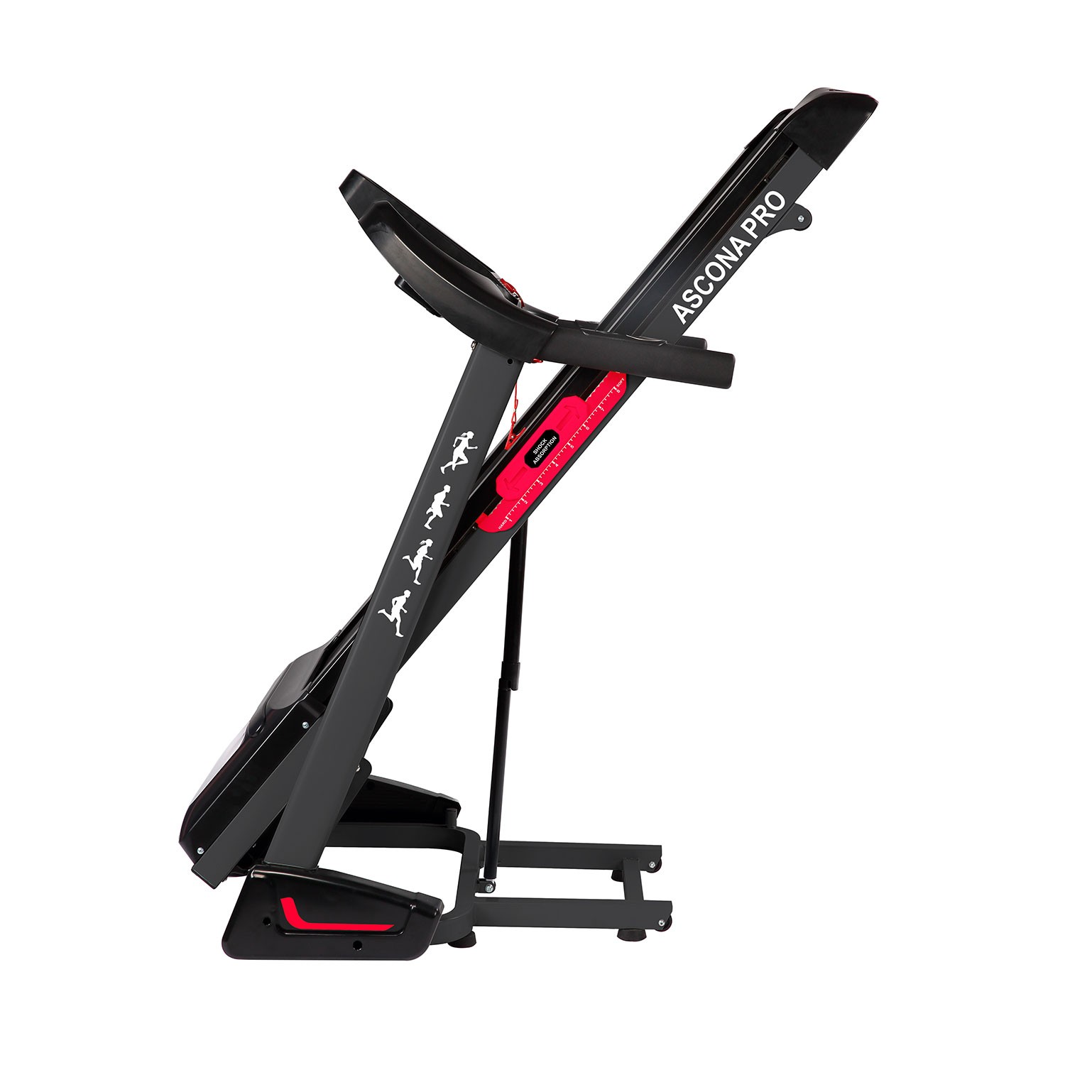 Представляем новую беговую дорожку от популярного бренда DFC — модель ASCONA Pro. Дорожка предназначена для домашнего применения. В арсенале модели встроенный двигатель постоянного тока мощностью 2,5 л.с. При пиковых нагрузках мощность увеличивается до впечатляющих 3,25 л.с. Шаг изменения скорости беговой дорожки 0,1 км/ч. Угол наклона бегового полотна изменяется c помощью дополнительного встроенного электромотора. Встроенные динамики звуковой системы и возможность подключения дополнительных устройств через MP3-разъем помогут провести тренировку под любимую мелодию. Амортизация с регулировкой жесткости поможет сохранить суставы про время продолжительной тренировки. Два комплекта встроенных в поручни датчиков пульса позволят следить за частотой сердечных сокращений. Такие датчики имеют определенную погрешность. Для точности показаний рекомендуем приобрести нагрудный пояс с монитором в форме часов DFC W117. Показания консоли : скорость, время, расстояние, калории, пульс. На поручнях так же расположены «быстрые кнопки» — это кнопки запуска и остановки бегового полотна, а так же кнопки изменения скорости. Это позволяет не отрывать руки с поручней во время занятий не тренажере. Дорожка имеет складную конструкцию для экономии жизненного пространства с помощью гидроцилиндра. И встроенные колеса для перемещения дорожки после тренировки.