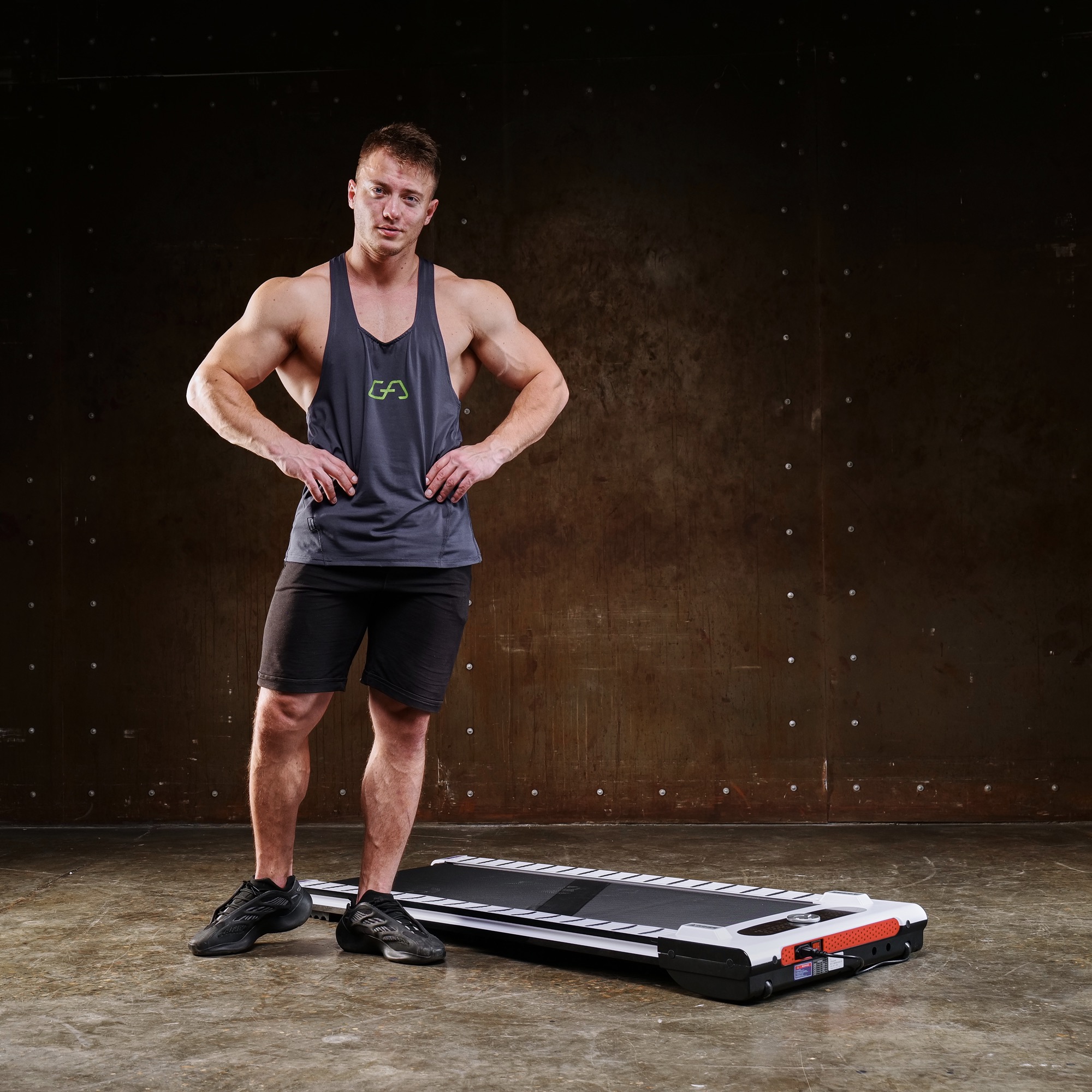 Максимальная нагрузка до 100 кг позволит использовать тренажёр людям разной комплекции. Управление осуществляется с удобной консоли, на которой отображаются все необходимые параметры: время, расстояние, калории и скорость. По бокам располагаются нескользящие накладки: встаньте сначала на них, запустите беговую дорожку, а затем переместитесь на полотно.