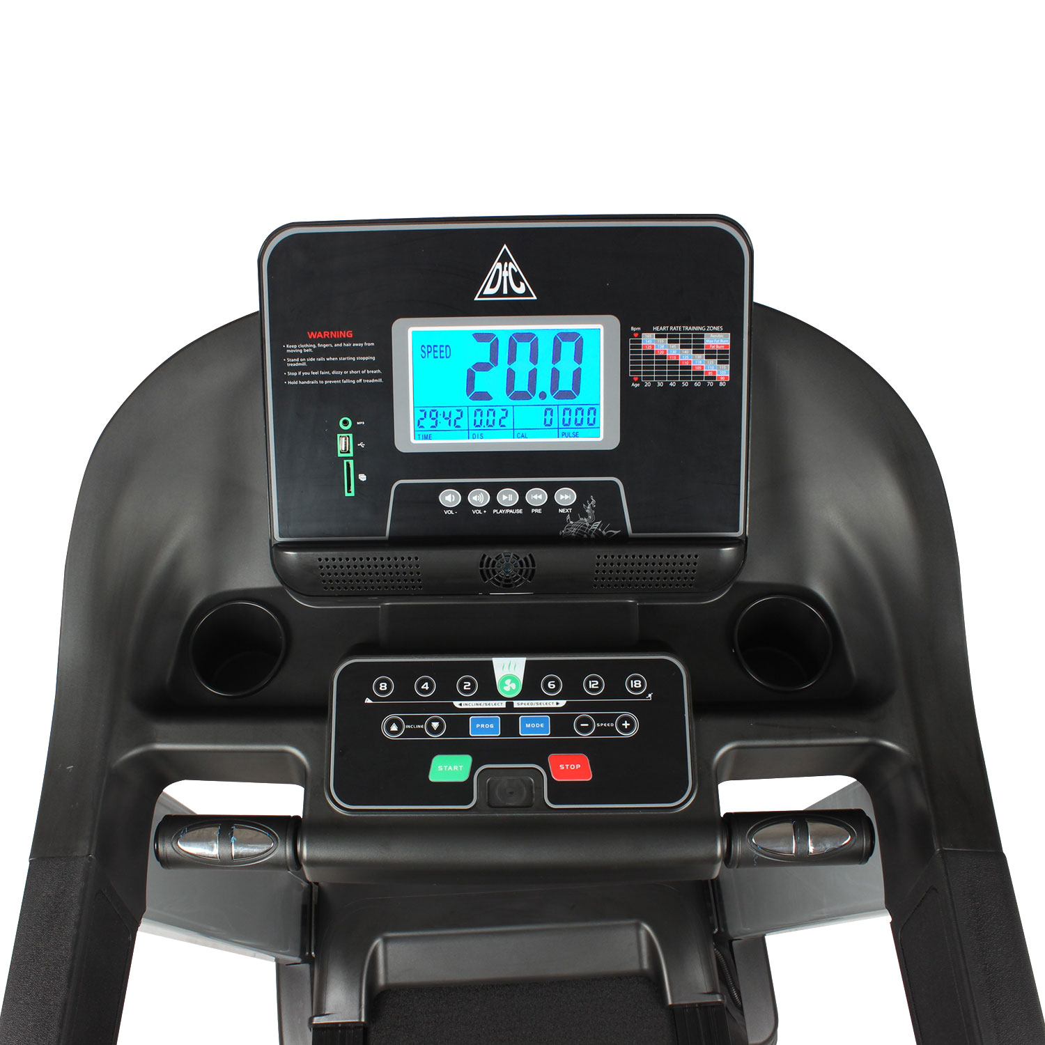 Сердцем любой дорожки является ее двигатель. Модель PREMIO оснащена мотором постоянного тока мощностью 3.0 л.с. Угол наклона бегового полотна изменяется с помощью дополнительного электромотора. Встроенные динамики звуковой системы и возможность подключения дополнительных устройств через разъемы MP3 и USB помогут провести тренировку под любимую мелодию. Кнопки управления проигрывателем удобно расположены под экраном на консоли. Провести тренировку с комфортом поможет встроенный в консоль вентилятор. Встроенные в поручни датчики позволят следить за частотой сердечных сокращений. Такие датчики имеют определенную погрешность. Для точности показаний рекомендуем приобрести нагрудный пояс с монитором в форме часов DFC W117.