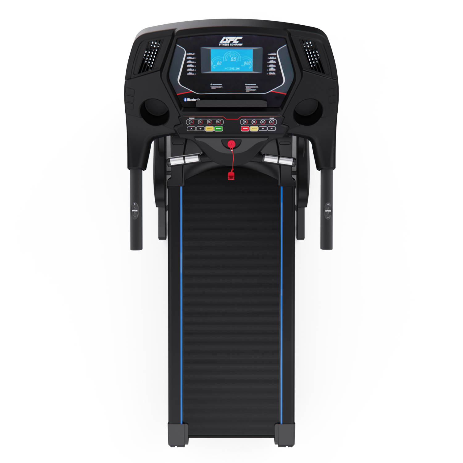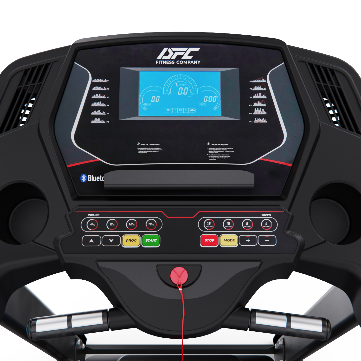 На поручнях так же расположены «быстрые кнопки» — это кнопки запуска и остановки бегового полотна, а так же кнопки изменения скорости. Это позволяет не отрывать руки с поручней во время занятий не тренажере.
