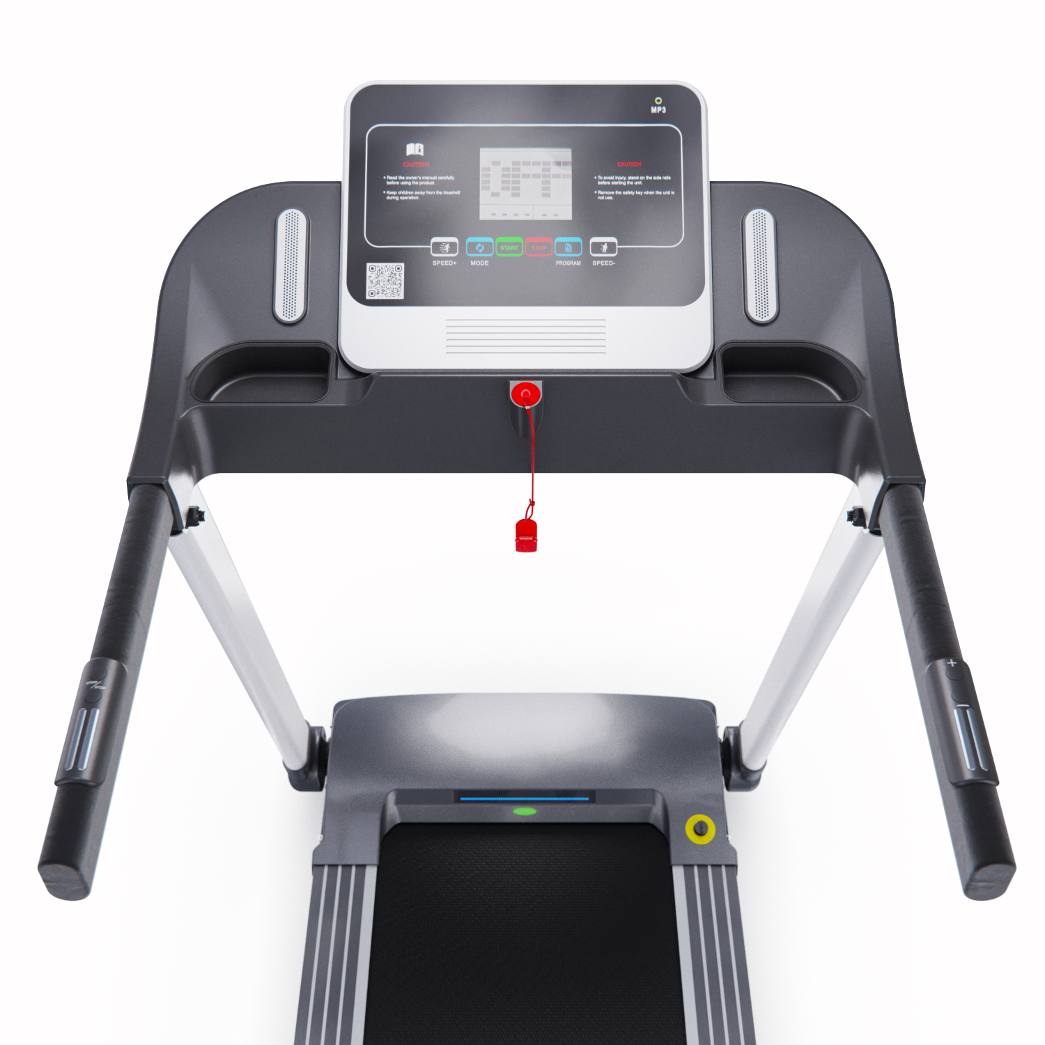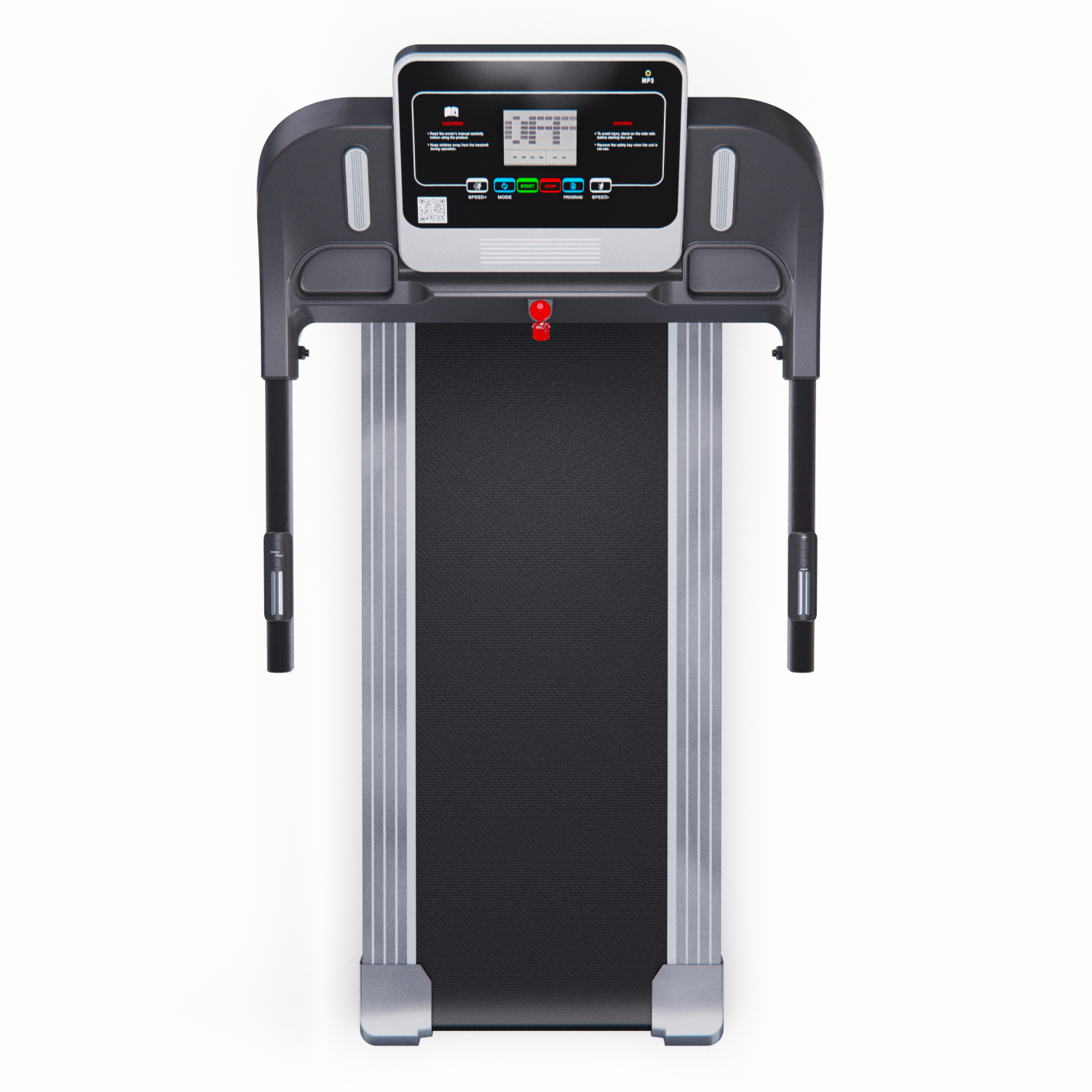 Для удобства пользователей предусмотрены сенсорные датчики пульса на поручнях, транспортировочные ролики и компенсаторы неровности пола. Монохромный LCD-дисплей размером 4 дюйма отображает время, скорость, дистанцию, калории и пульс. В дорожке есть MP3-вход и 12 встроенных программ, а также поддержка приложения SPAX с помощью Bluetooth-соединения.