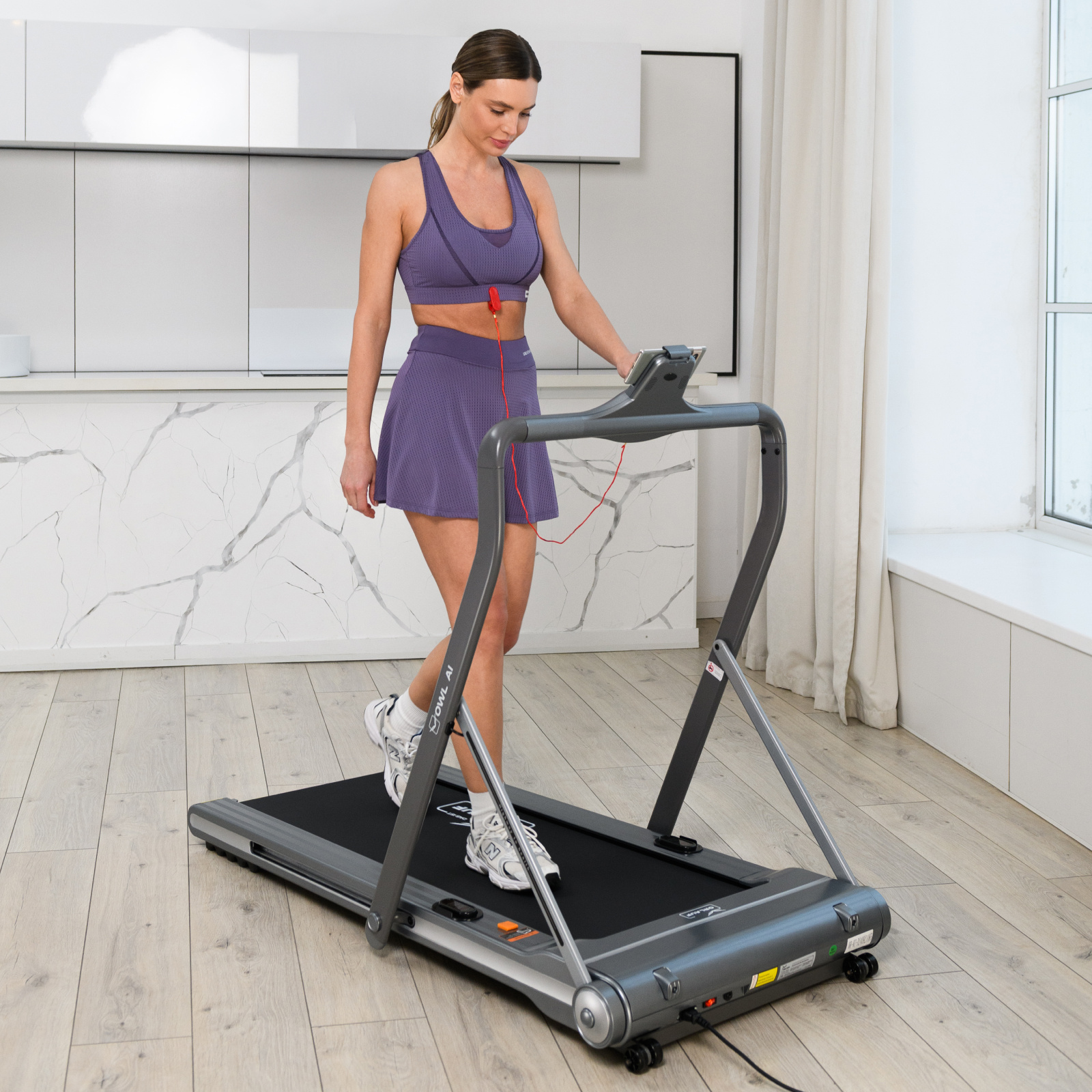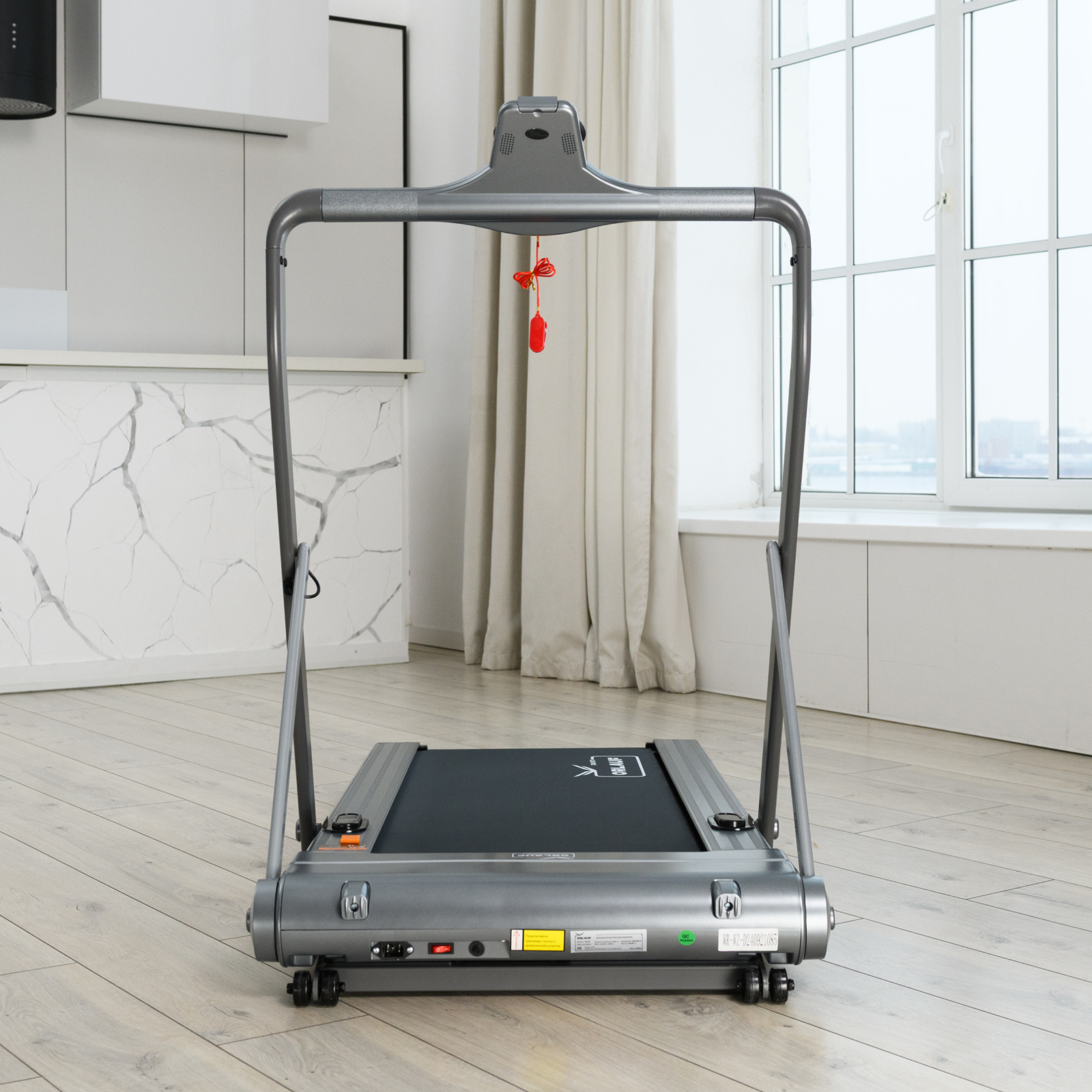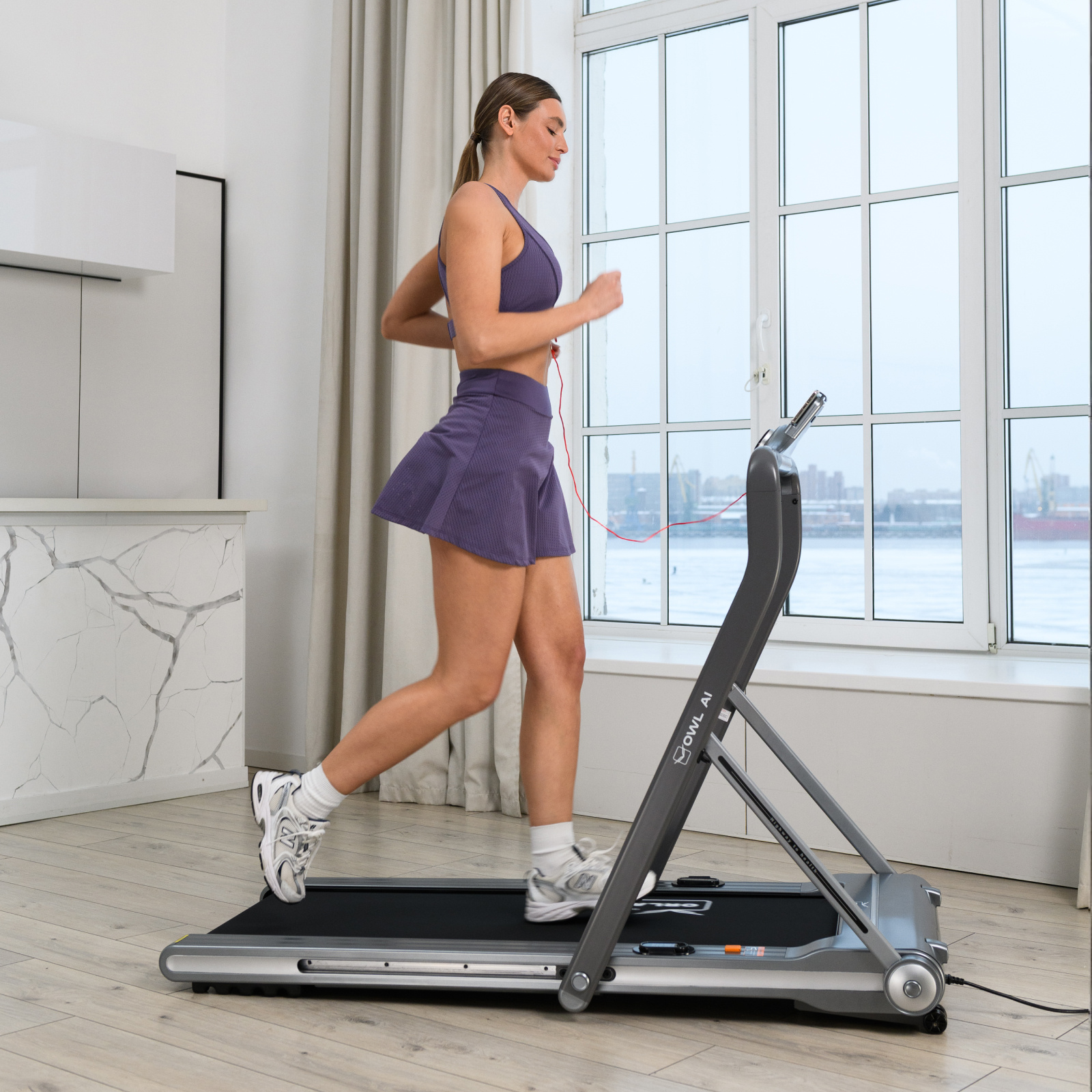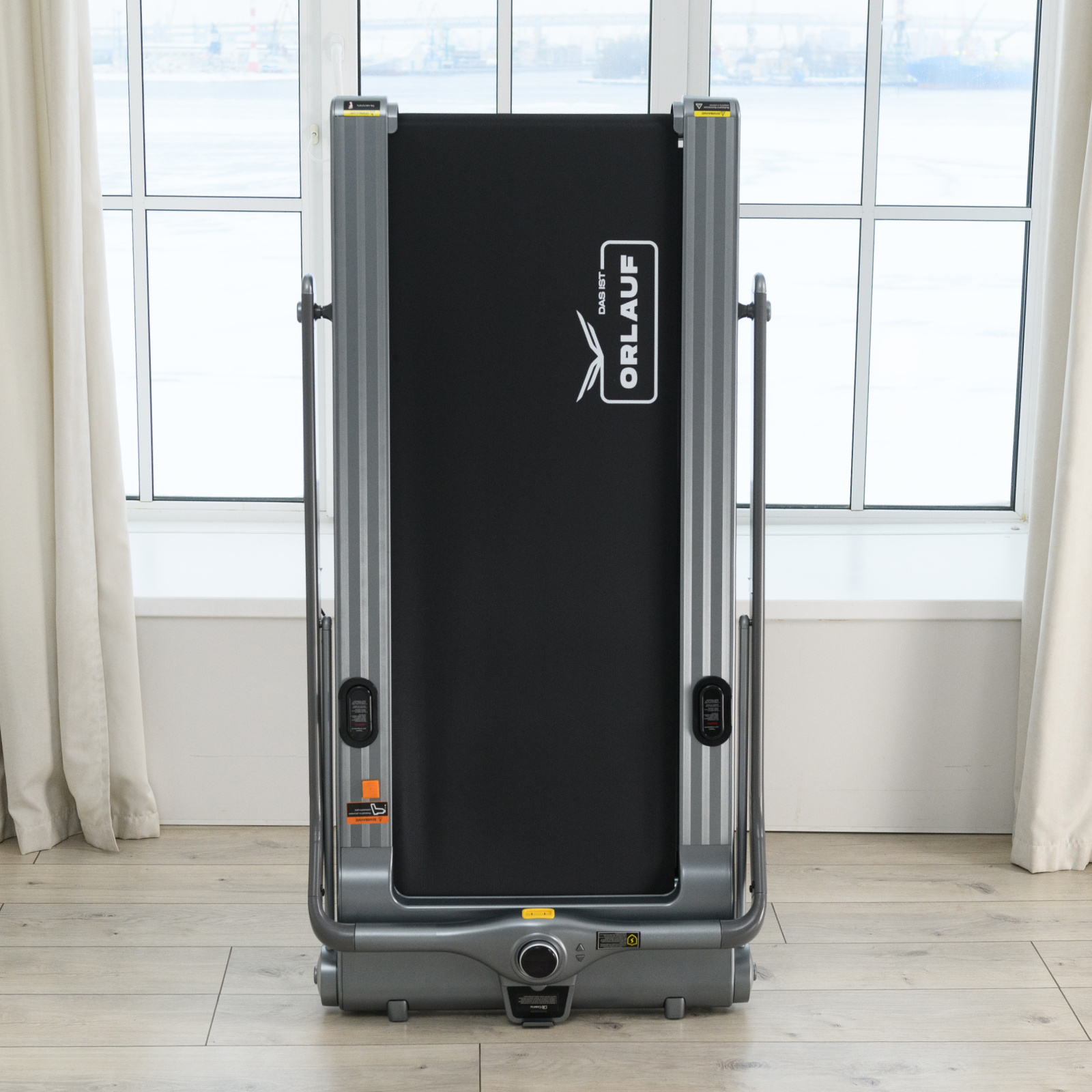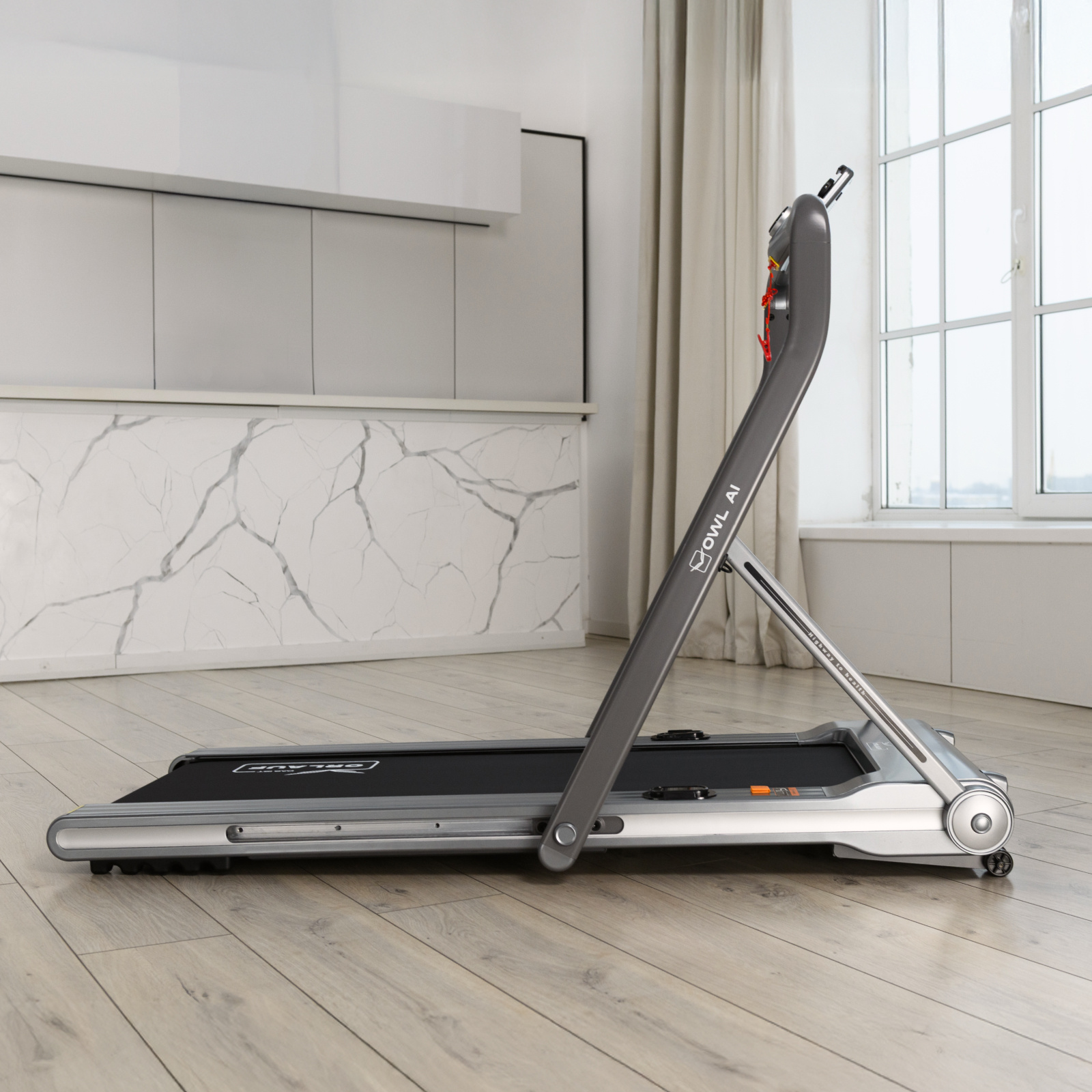 Электрическая беговая дорожка Orlauf Owl AI – это компактное решение для домашних тренировок. Модель отличается удобной системой складывания Click-Clack, позволяющей быстро трансформировать дорожку одним движением. В сложенном виде толщина составляет всего 24 см, что обеспечивает удобное хранение как в горизонтальном, так и в вертикальном положении.