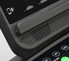 Модель FERRUM M имеет весь необходимый набор для проведения эффективных тренировок. Тренировочный компьютер оснащен голубым LCD-дисплеем диагональю 5 дюймов и отображает следующие показатели: скорость, время, шагометр, дистанция, калории, наклон, пульс. В памяти консоли содержится 19 программ, 9 из которых помогут пользователям начать тренировочный процесс вне зависимости от их уровня подготовки (легкий бег, холмы, интервальная тренировка, гора, сжигание жира, пересеченная местность, выносливость, темповая тренировка, снижение веса). Помимо предустановленных программ, можно воспользоваться регулируемым ручным режимом и одной из 3-х пользовательских программ. Есть здесь и 3 пульсозависимые программы, а также 3 целевые (калории, время, дистанция). В модели FERRUM M встроен высокоточный беспроводной приемник для определения частоты пульса и просто комфортной тренировки. Для определения точных показателей пульса рекомендуется использовать телеметрический ремень-передатчик Polar T34. Пользователь может слушать любимую музыку через встроенные динамики мощностью 3 Ватт, достаточно подключить оборудование к разъему AUX. Приятными дополнениями являются подставка под планшет или смартфон, а также 2 места для бутылочек с водой.