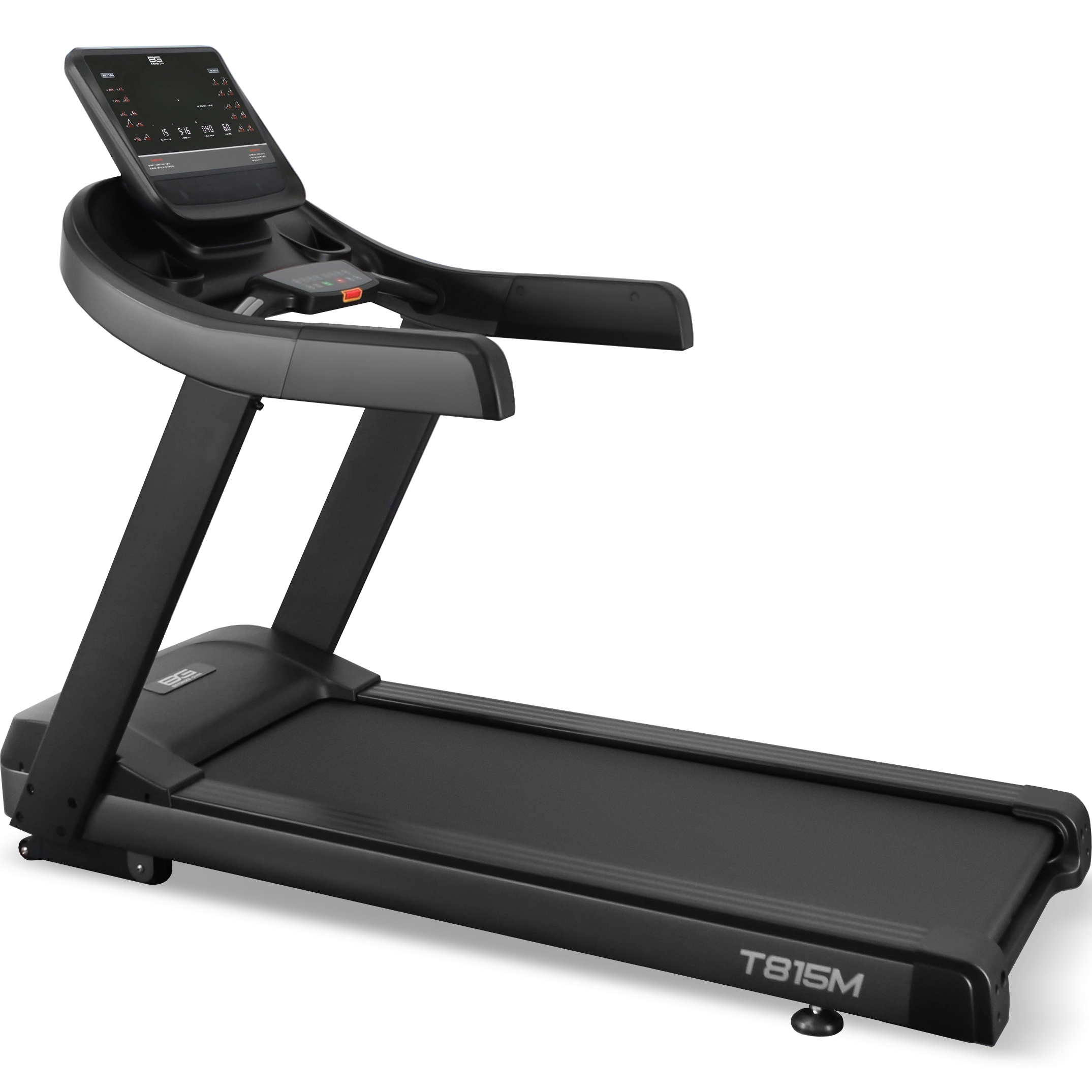 Bronze Gym T815M — полупрофессиональная дорожка для использования в отелях, санаториях, небольших корпоративных залах и других аналогичных объектах со сравнительно небольшой проходимостью. Модель выполнена в строгом дизайне и классическом форм-факторе. На беговой дорожке установлен двигатель переменного тока (AC) мощностью 4 л.с. производства японской Fuji Electric Co., рассчитанный на эксплуатацию до 8 часов в день. Дорожка достаточно тяжелая, ее нетто-вес составляет 109 кг, максимальный вес пользователя — 160 кг. По своим остальным характеристикам Bronze Gym T815M полностью соответствует заявленному уровню — максимальная скорость 20 км/ч, угол наклона от 0 до 15%, беговое полотно высокой износостойкости толщиной 2.5 мм и размером беговой зоны 150*56 cм. Надежный амортизационный блок настроен на коммерческие режимы эксплуатации. Амортизация настроена на средний уровень жесткости благодаря мультиабсорбирующей динамической системе на основе 8 эластомеров по периметру беговой поверхности. Тренировочный компьютер оснащен LED дисплеем с точечной матрицей. Основной экран дополняют 4 небольших буквенно-цифровых LED-дисплеев с белой подсветкой. На мониторах отображаются следующие данные: программный анимированный профиль, время, скорость, шаги, дистанция, калории, пульс, угол наклона, индикатор напоминания о необходимости смазки. В число самих программ входят 24 режима, направленных на решение самого широкого спектра задач – от развития силы и выносливости до снижения веса и улучшения сердечно-сосудистой системы. Помимо предустановленных программ, можно воспользоваться самостоятельно регулируемым ручным режимом, а также создать собственную программу в одном из 3-ех пользовательских режимов. Здесь также есть и 3 целевые тренировки (время, дистанция, калории). Мультимедийная компонента представлена встроенными динамиками с разъемами AUX и USB для подключения мобильных устройств и воспроизведения через них аудио-файлов. Порт USB предназначен для зарядки мобильных устройств. Через USB-вход также можно подсоединить флешку для воспроизведения аудио или видео. Дорожка имеет транспортировочные ролики и компенсаторы неровностей пола. Приятной опцией является подставка под телефон или планшет, а также 2 отсека для емкостей и личных аксессуаров.