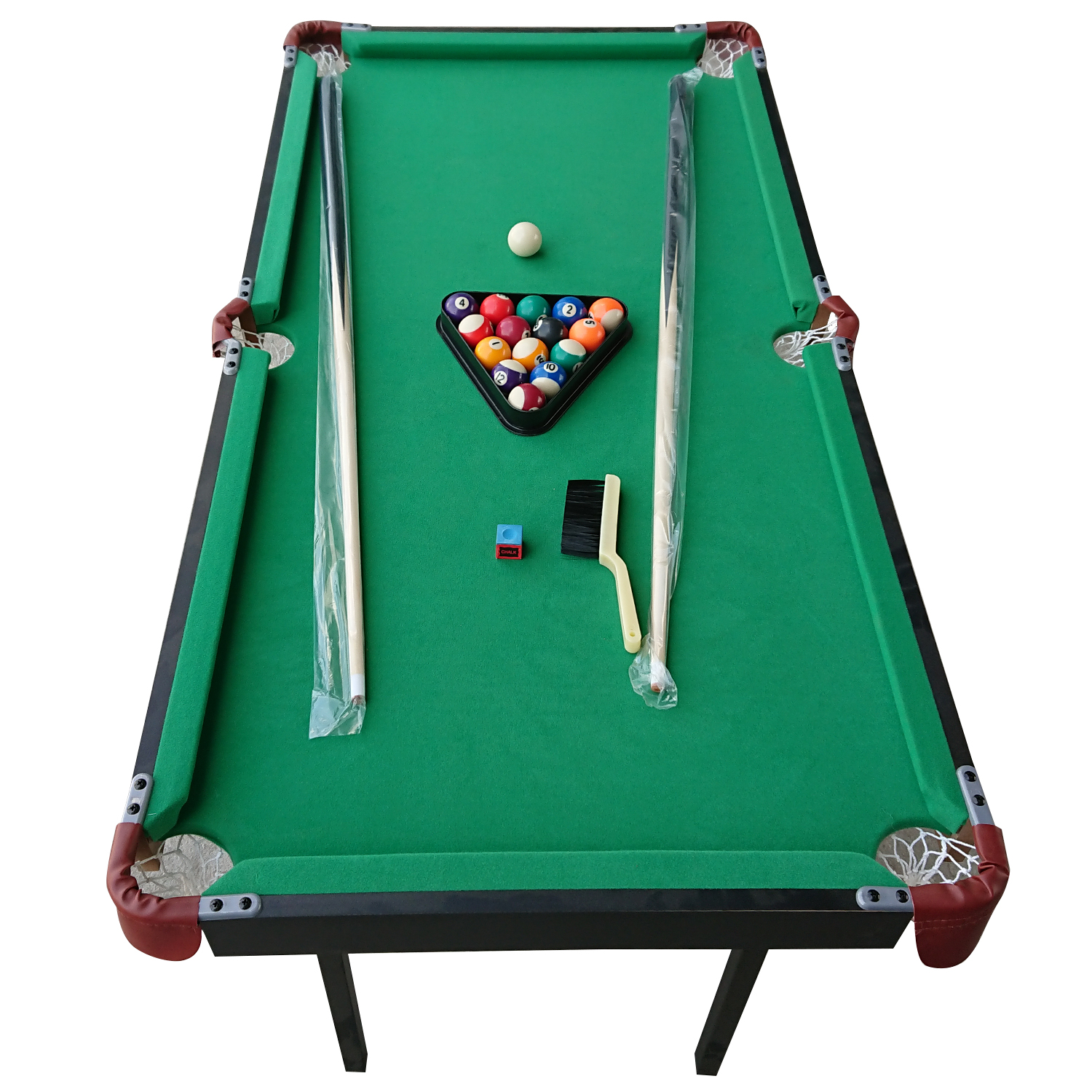 В комплекте все необходимые акссесуары: 2 кия, набор шаров для пула, треугольник, щетка, 2 мела.