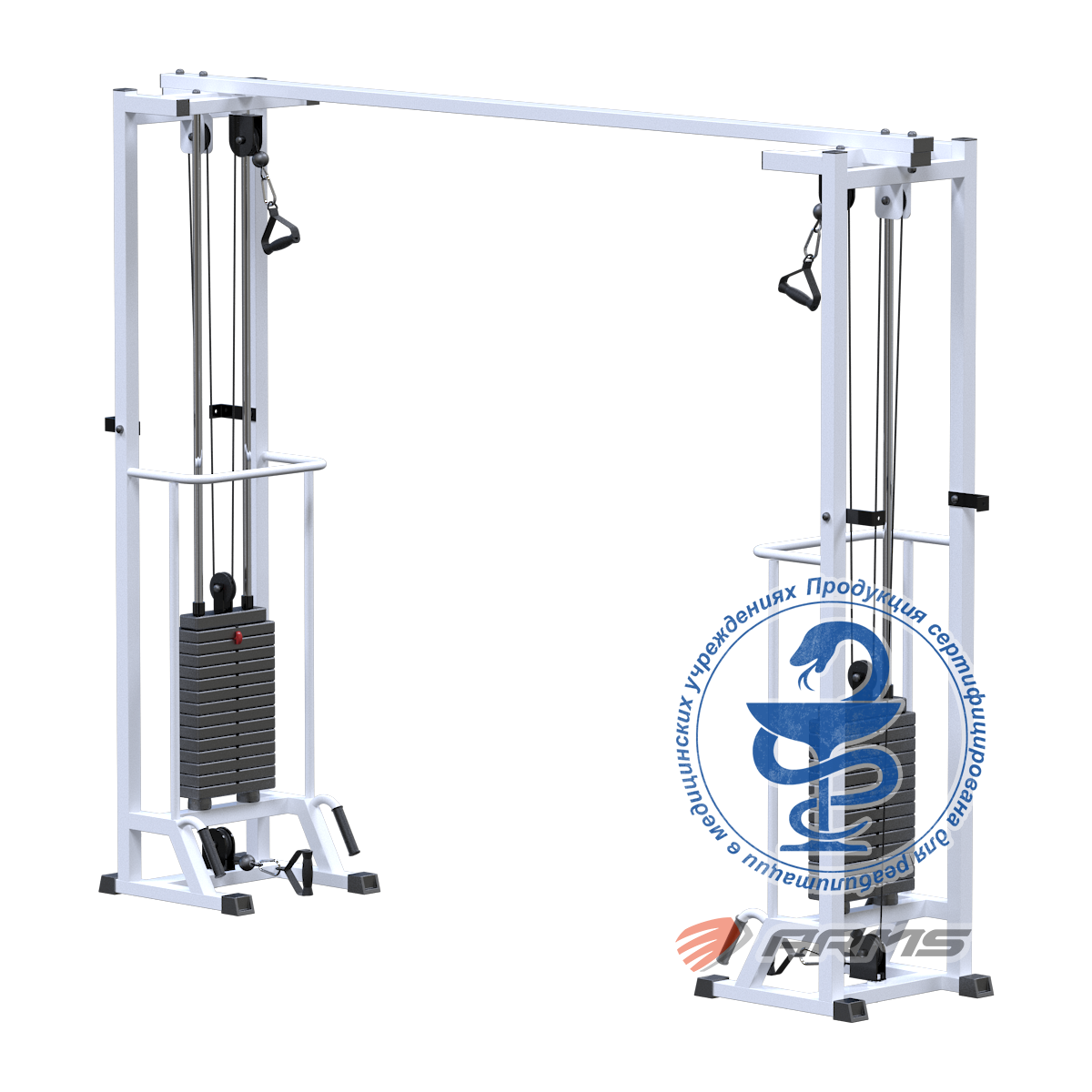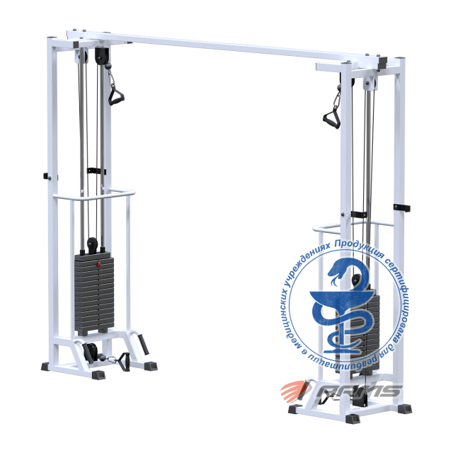 Грузоблочный стек тренажера состоит из металлических обрезиненных плит весом по 5кг, и хромированных направляющих. Изменение нагрузки происходит при помощи металлической иглы(фиксатора). Для приведения в движение грузов используется трос 5 мм в пвх оплетке с усилием на разрыв 500 кг с максимальной нагрузкой – 800кг.