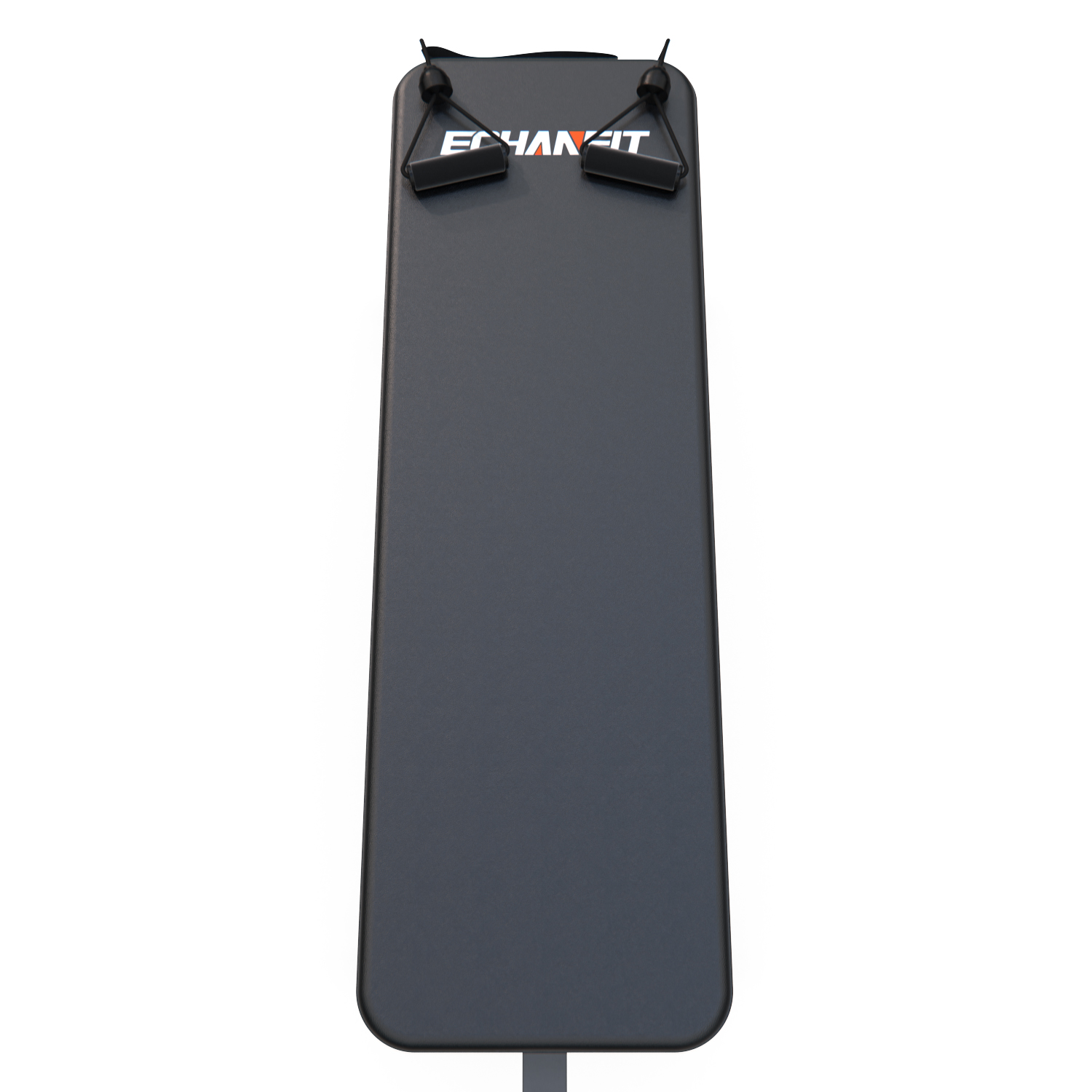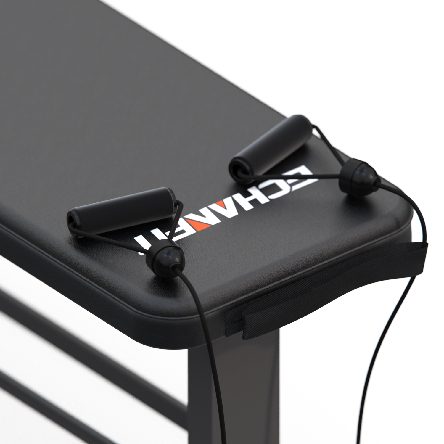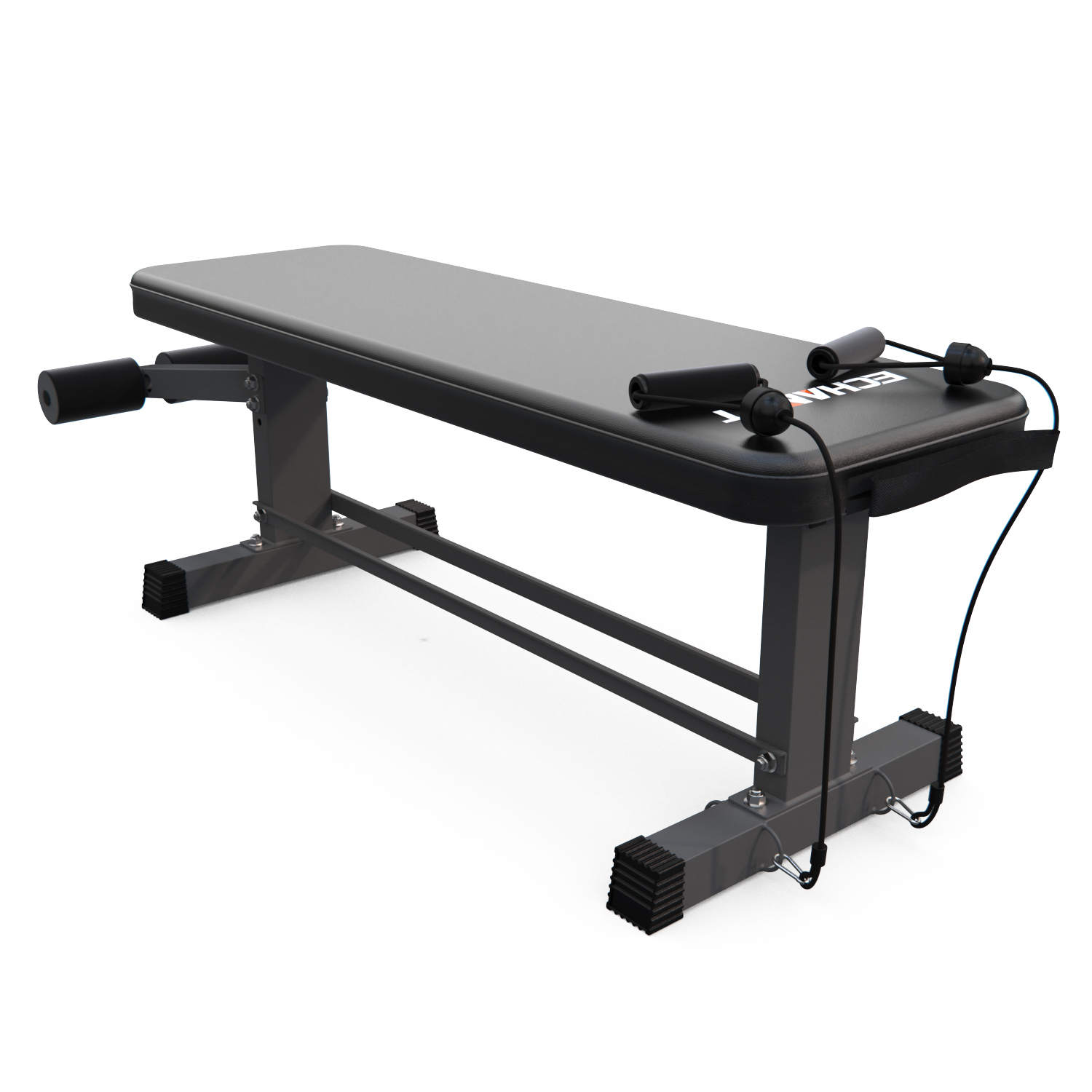 Скамья дополнительно оснащена креплениями для гантелей для удобного хранения, а также быстрого доступа к ним во время тренировки. Валик для ног диаметром 7,5 см и длиной 13,2 см с надежным креплением длиной 34 см. Эспандеры, поставляющиеся в комплекте длиной 80 см служат для дополнительного укрепления мышц рук.