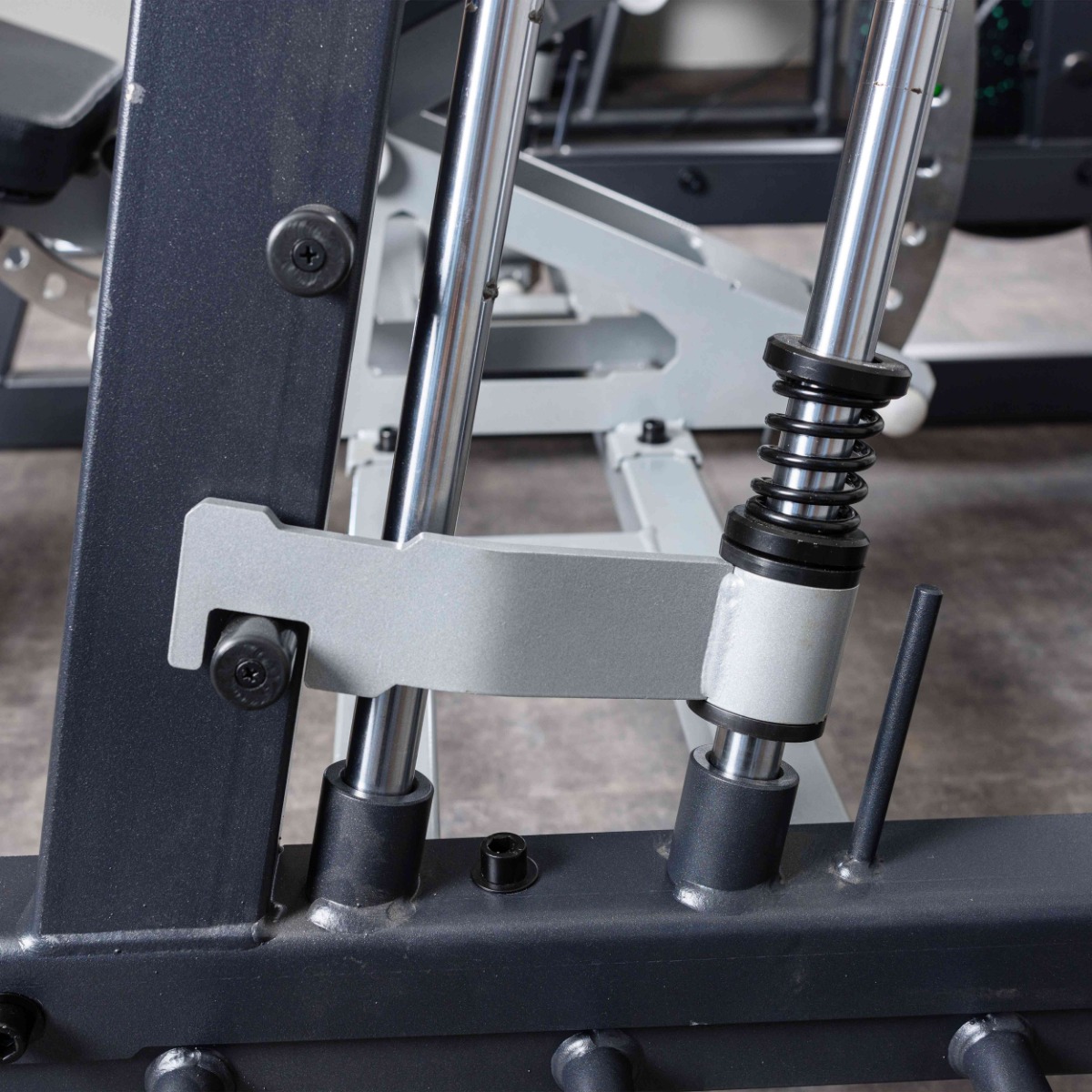 На раме тренажера установлено шесть хромированных накопителей из толстостенной стальной трубы для хранения свободных весов и два на подвижных рычагах.