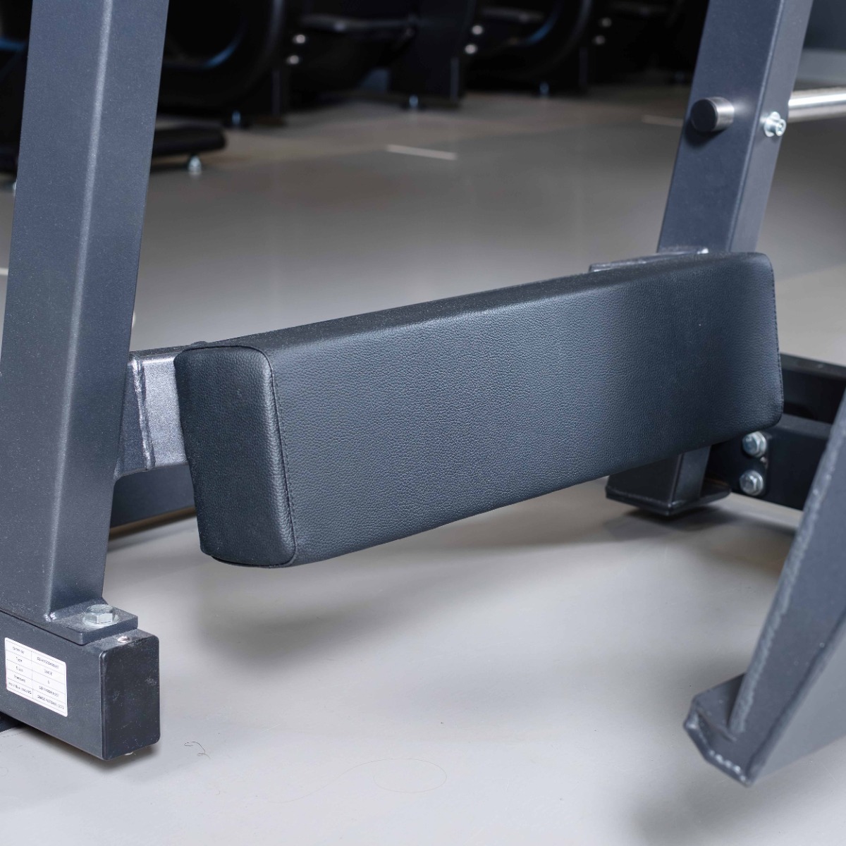 Накопитель на подвижном рычаге и статичный для хранения оборудованы кольцами из плотной резины толщиной 20 мм для предотвращения соприкосновения дисков с рамой тренажера и амортизации при размещении свободных весов на накопителях.