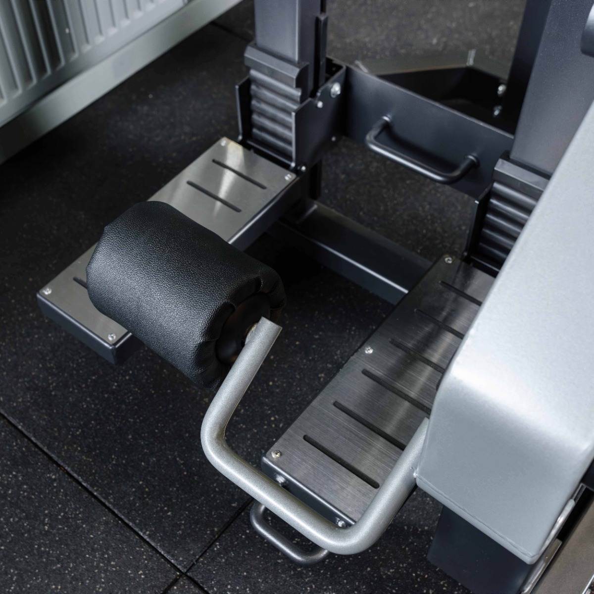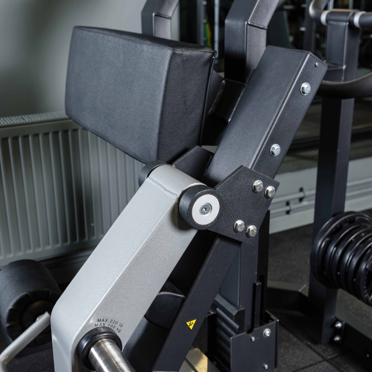 Накопители на подвижном рычаге и статичный для хранения оборудованы кольцами из плотной резины для предотвращения соприкосновения дисков с рамой тренажера и амортизации при размещении свободных весов на накопителях.