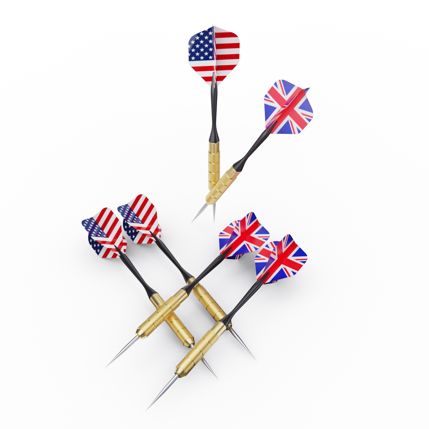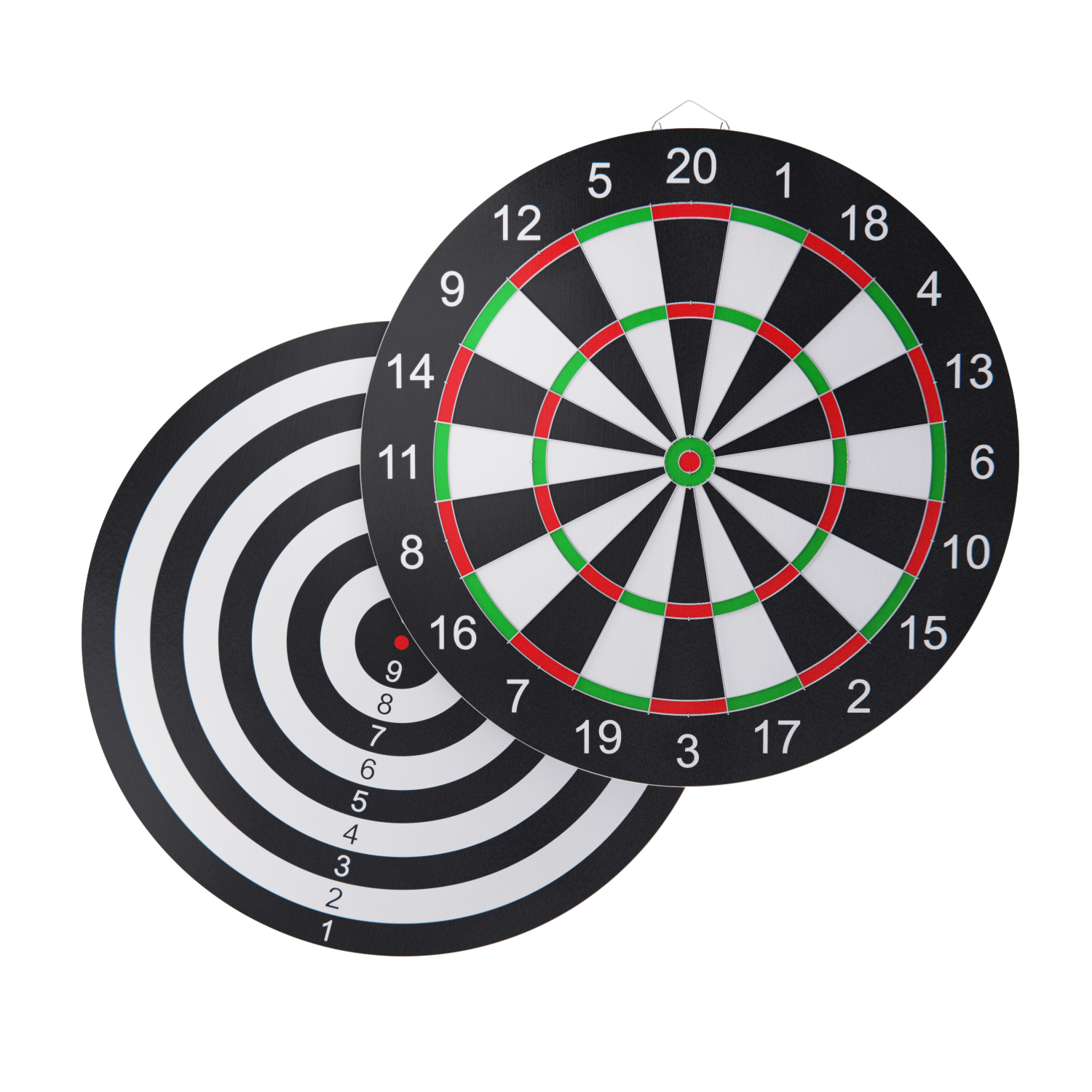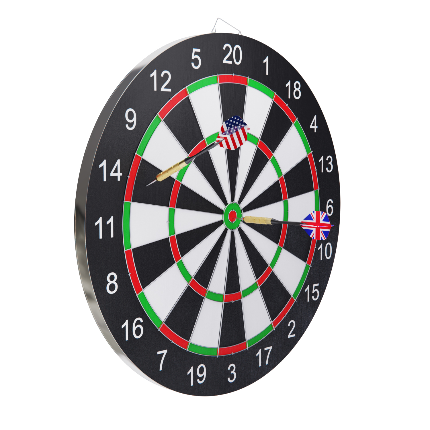 Комплект мишени включает в себя 6 дротиков с металлическими наконечниками и имеет 2 разные мишени с двух сторон. Кроме того, в комплекте идут флайты с американским и английским флагами, что делает эту мишень еще более интересной. Диаметр мишени составляет 43 см.