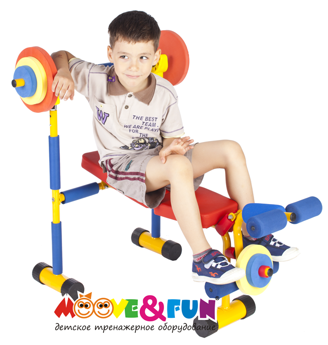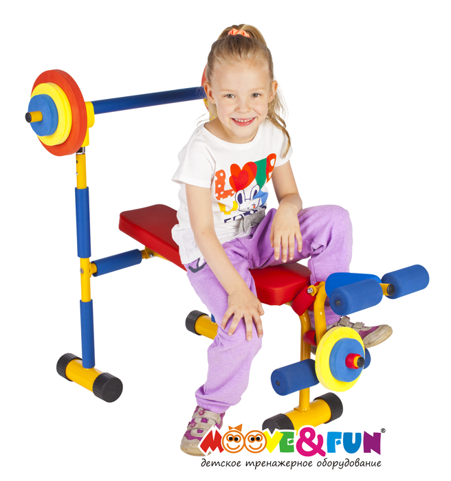 Универсальная детская скамья для работы со штангой и нагружаемым керлом для ног. Штанга входит в комплект. Эргономика тренажера специально разрабатывалась для детей. Имеет прочную и устойчивую конструкцию. Стойки имеют регулировку вылета. Диски (веса) штанги выполнены из полиуретана, что делает тренировки безопасными. Максимальный вес ребенка 50 кг.
