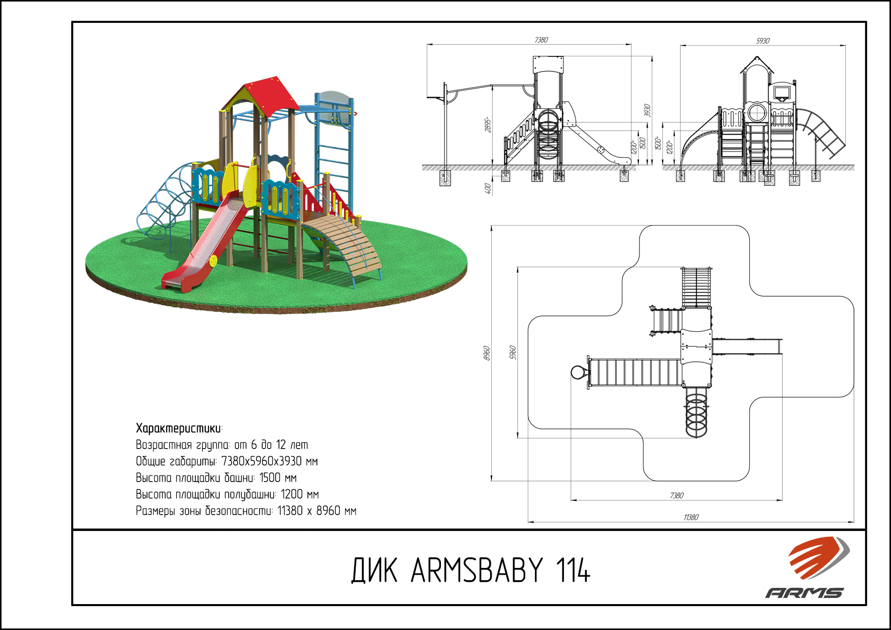 Игровой комплекс оборудован горкой со скатом из нержавеющей стали, вертикальными лестницами и лестницей со ступенями, изогнутой стенкой для скалолазания с канатом, трубой из колец, рукохода, шведской стенкой, баскетбольного щита с кольцом, турниками, ручками, фанерными ограждениями.