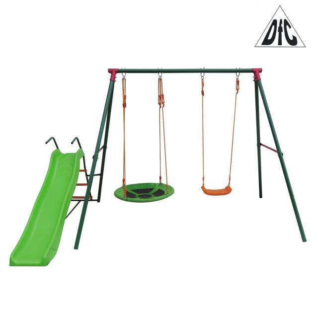 Комплекс включает в себя: веревочные качели (без спинки), качели — гнездо, а так же горка.