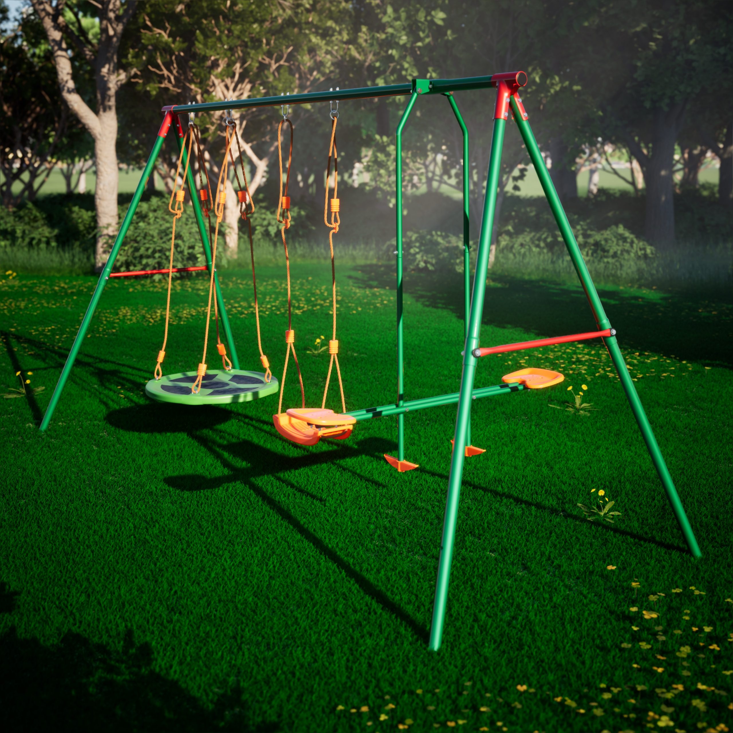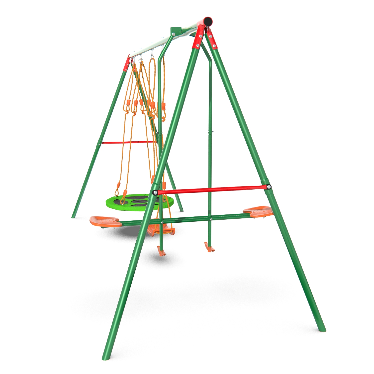 В комплект входят 3 вида качелей — гнездо, планер и классические веревочные качели, канаты которых изготовлены из полиэтилена — безопасного и устойчивого к любым видам воздействий материала. Габаритные размеры комплекса составляют 318x156x192 см, вес — 32 кг.