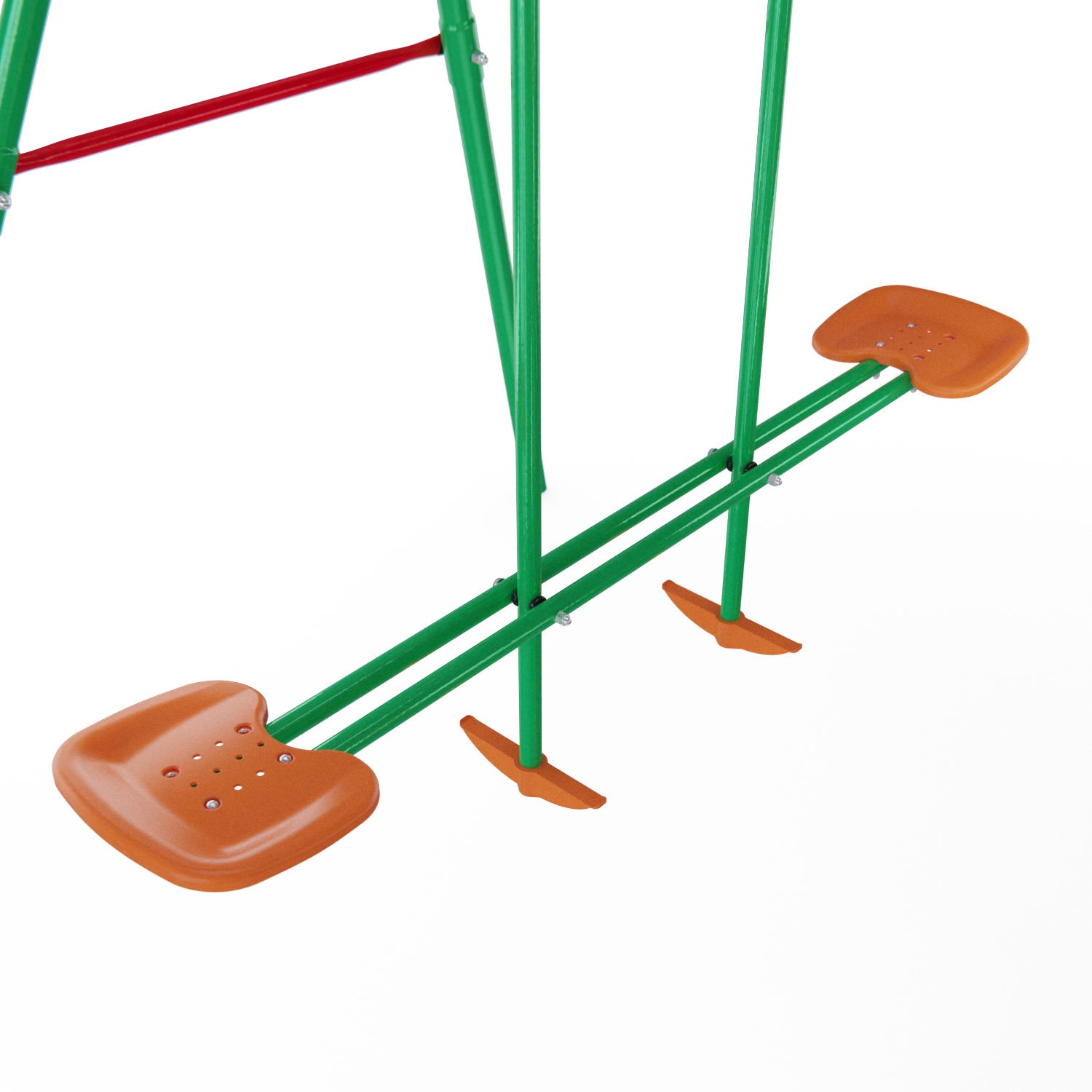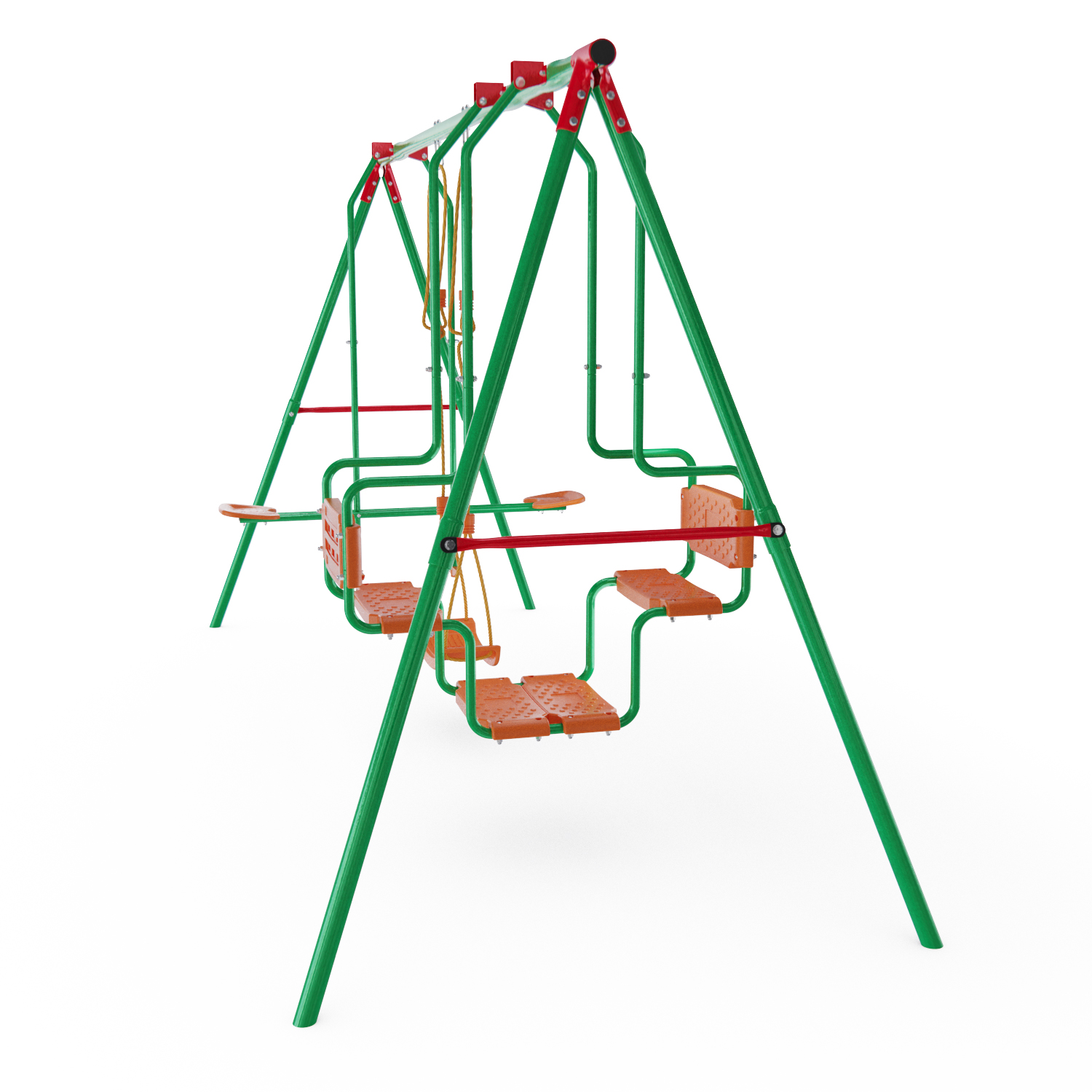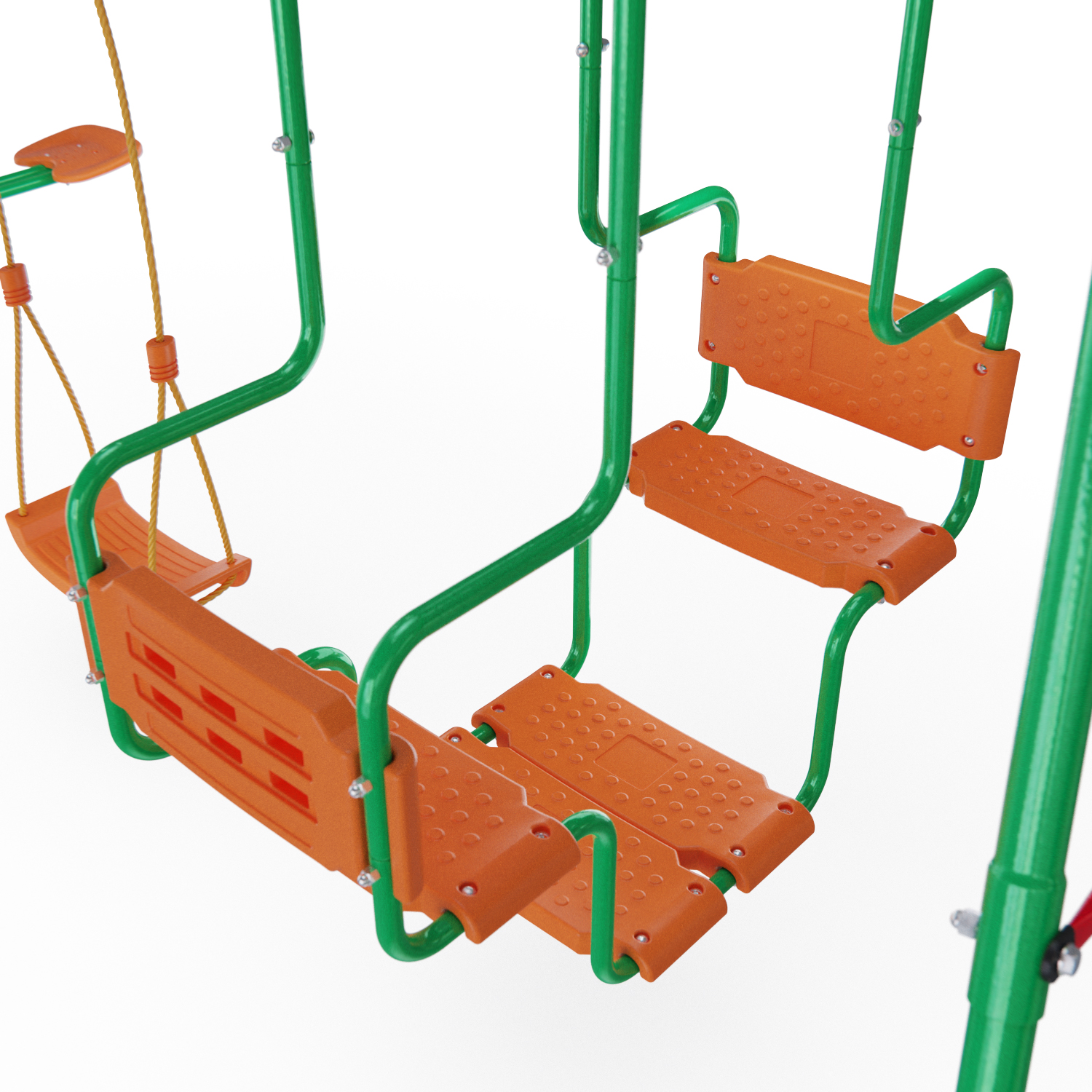 Устойчивость такой массивной конструкции достигается за счёт применения широкого профиля — 45×1,5 мм и 50,8×2 мм — который выдерживает нагрузку до 175 кг! Сиденья качелей имеют ребристую поверхность для предотвращения соскальзывания детей. Качели могут безопасно эксплуатироваться детьми от 3 лет.