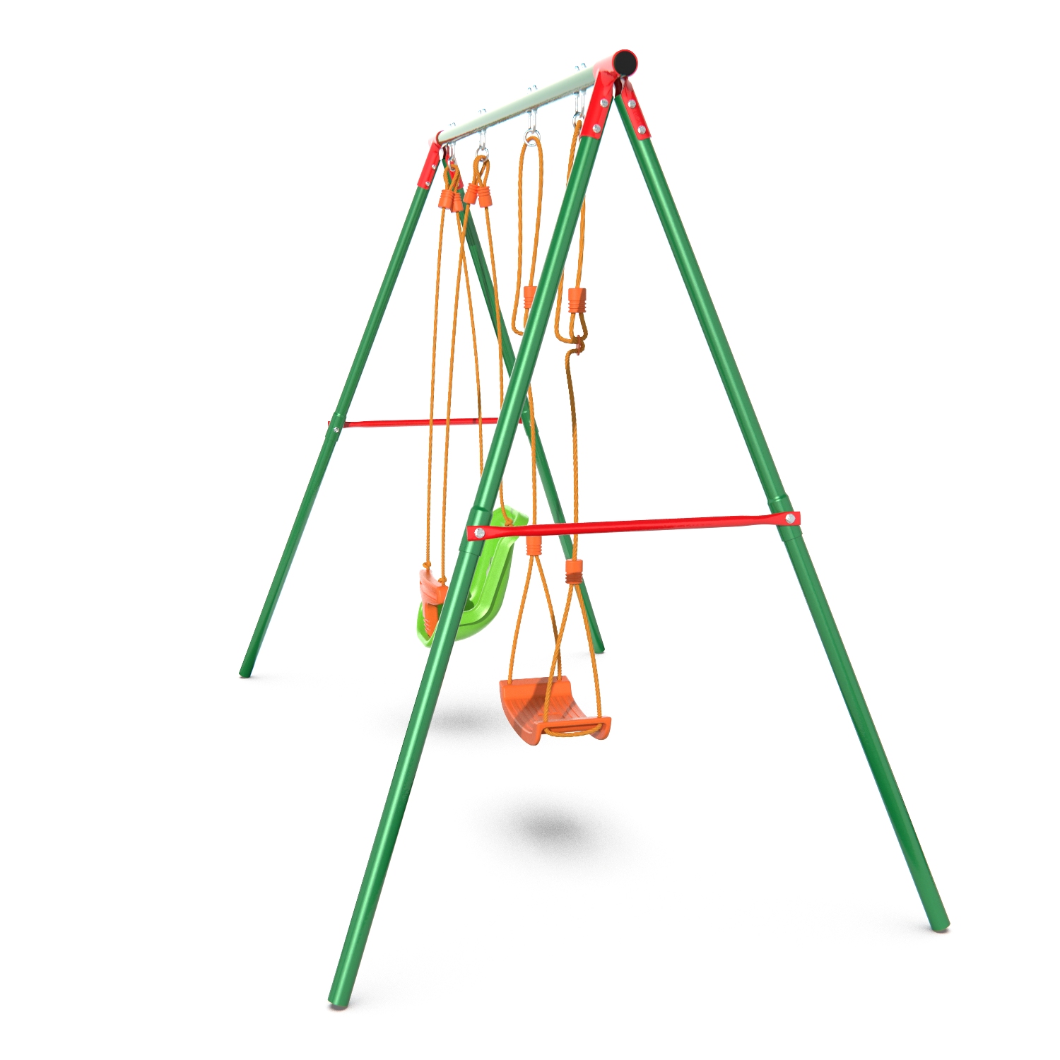 В состав комплекса входят качели для разных возрастов: веревочные, оборудованные сиденьем, аналогичным детскому автокреслу, с ремнями безопасности и перемычкой между ножек, подойдут для малышей от 18 месяцев, а классические качели с плоским сиденьем — для деток постарше, от 3 лет. Габариты приличные — 227×156×196 см — поэтому больше подойдут для установки во дворе, но при наличии свободного пространства можно установить и дома. Максимальная нагрузка 70 кг.