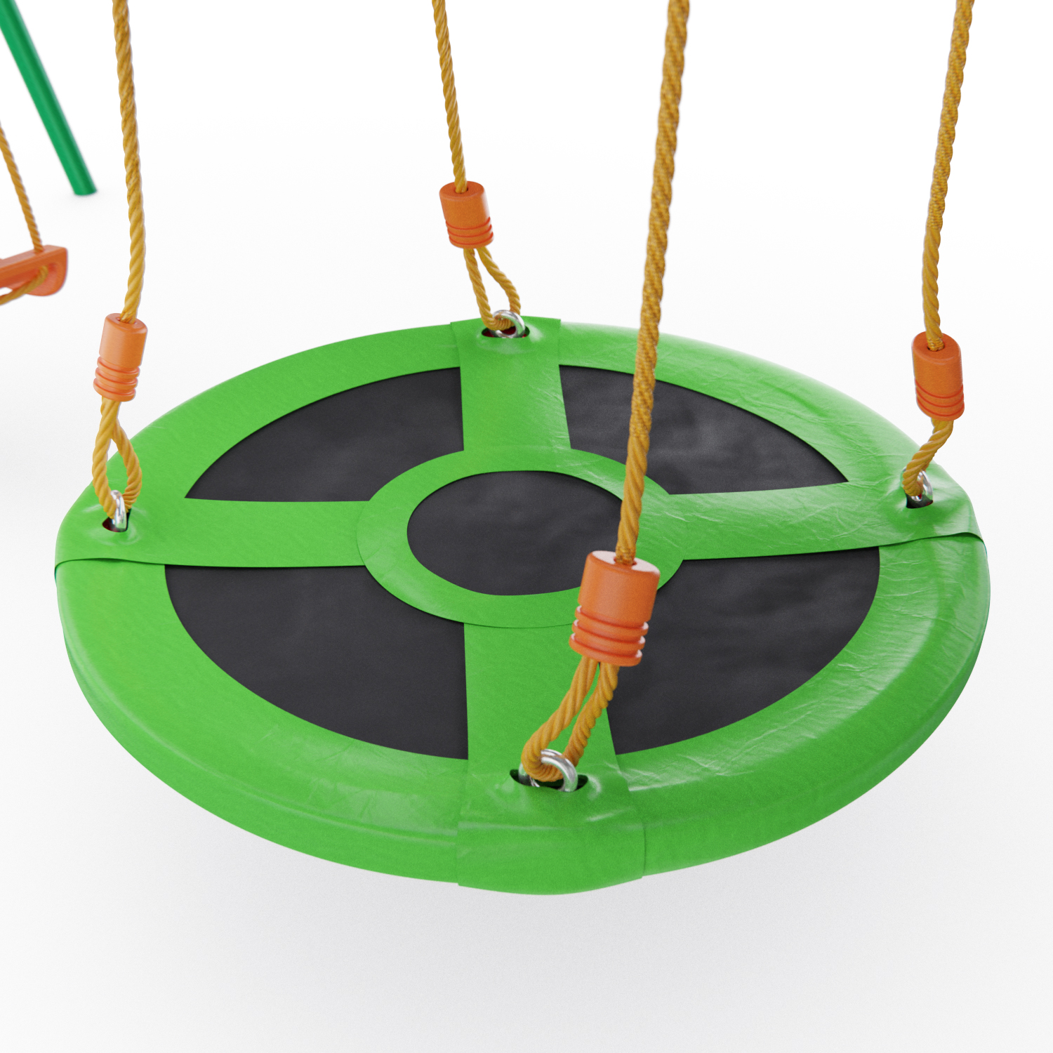 Габариты комплекса составляют 274×156×196 см и обеспечивают достаточное количество свободного пространства для исключения травматизации детей, при этом разместить его можно и дома, поскольку он довольно компактен. В состав комплекса входят веревочные качели, которые мы так любили в детстве, и качели-гнездо — уже более современный вариант.