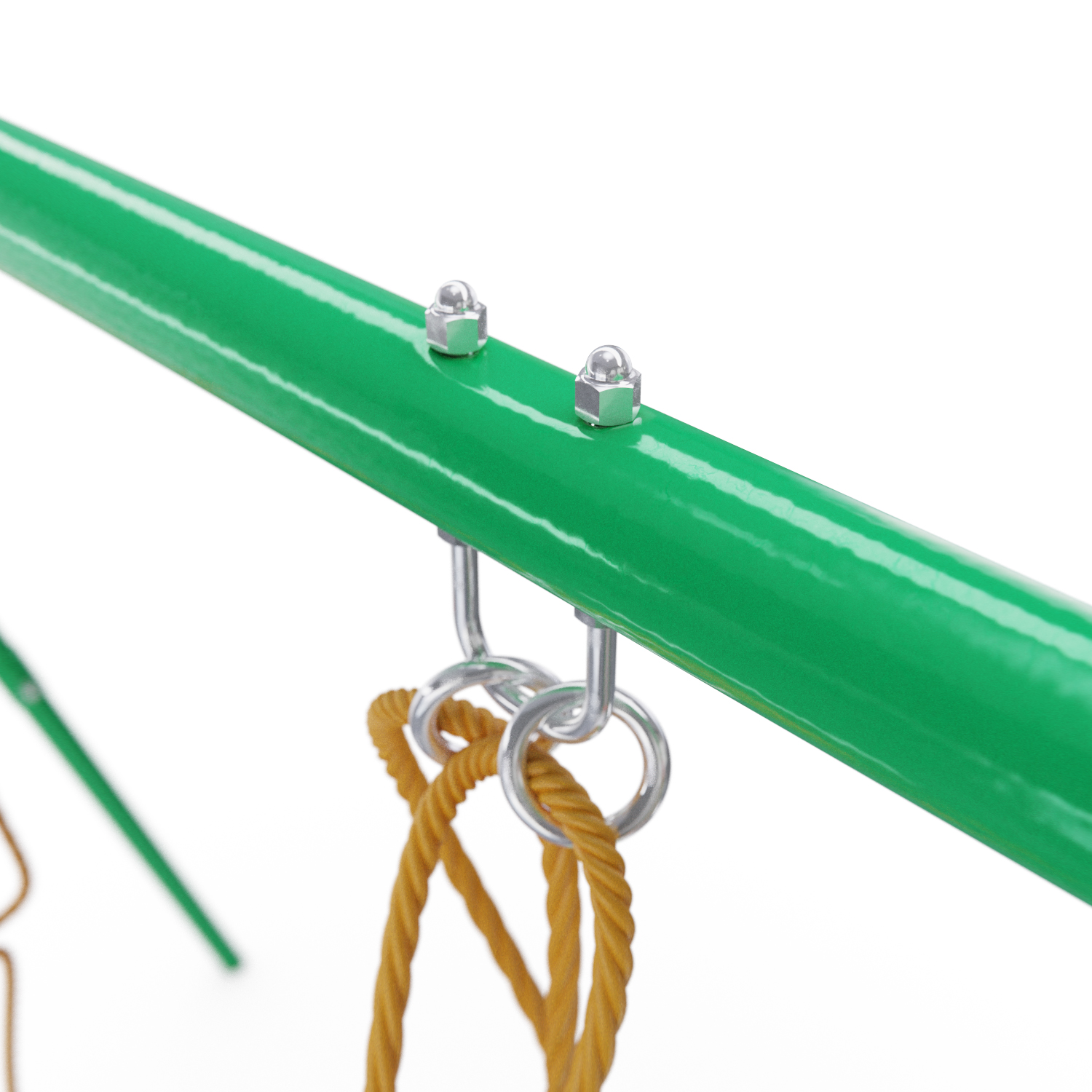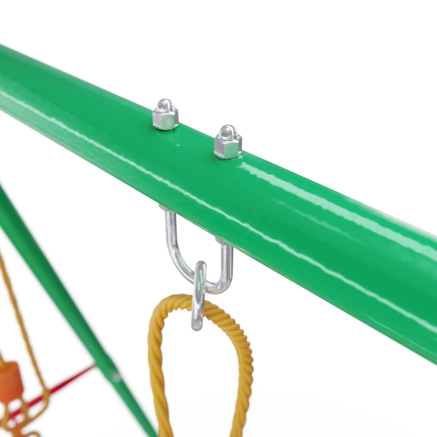 Опорные элементы качелей выполнены в виде каркаса из стального профиля 25, 4×1,0 мм, 45×1,5 мм и 50,8×2 мм повышенной прочности — характеристики стали соответствуют государственным стандартам и требованиям безопасности; каркас усилен дополнительными элементами для увеличения жесткости и надежности. Играть на комплексе разрешается детям от 3 лет. Максимальная нагрузка 70 кг.