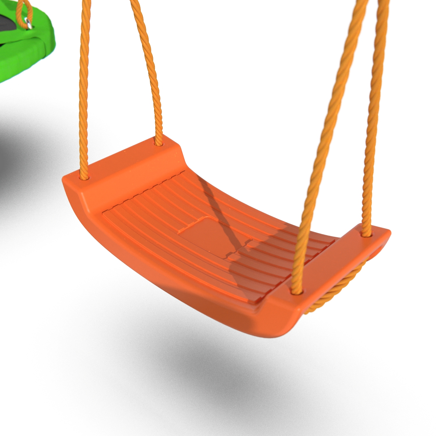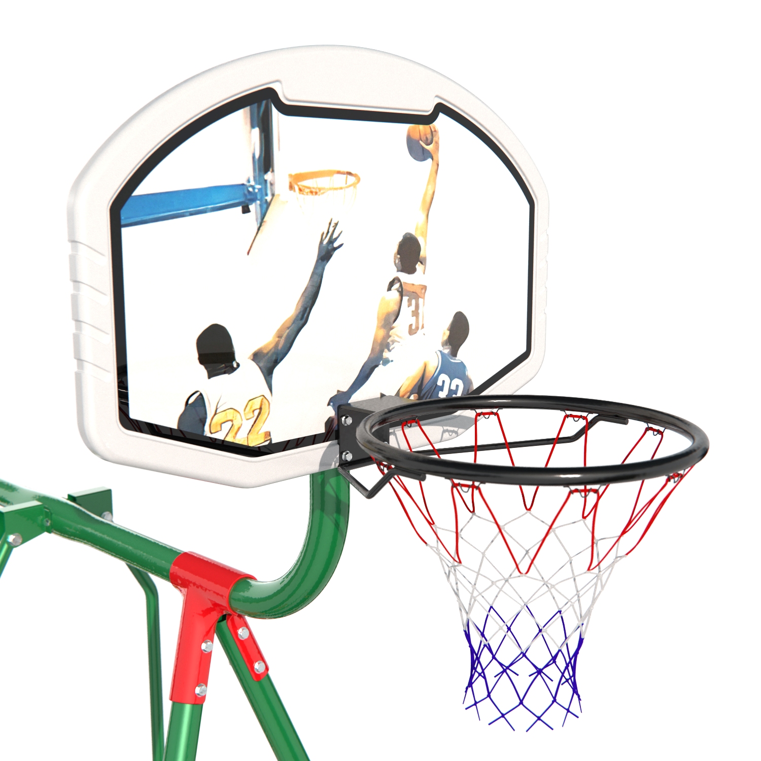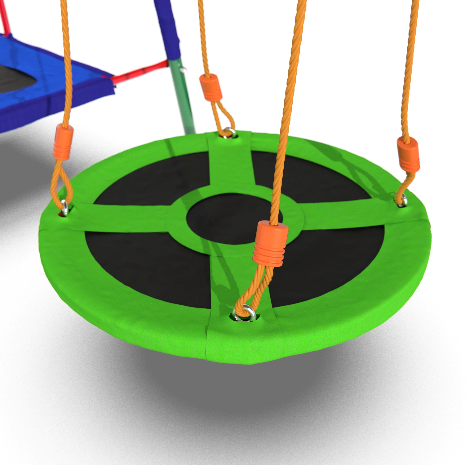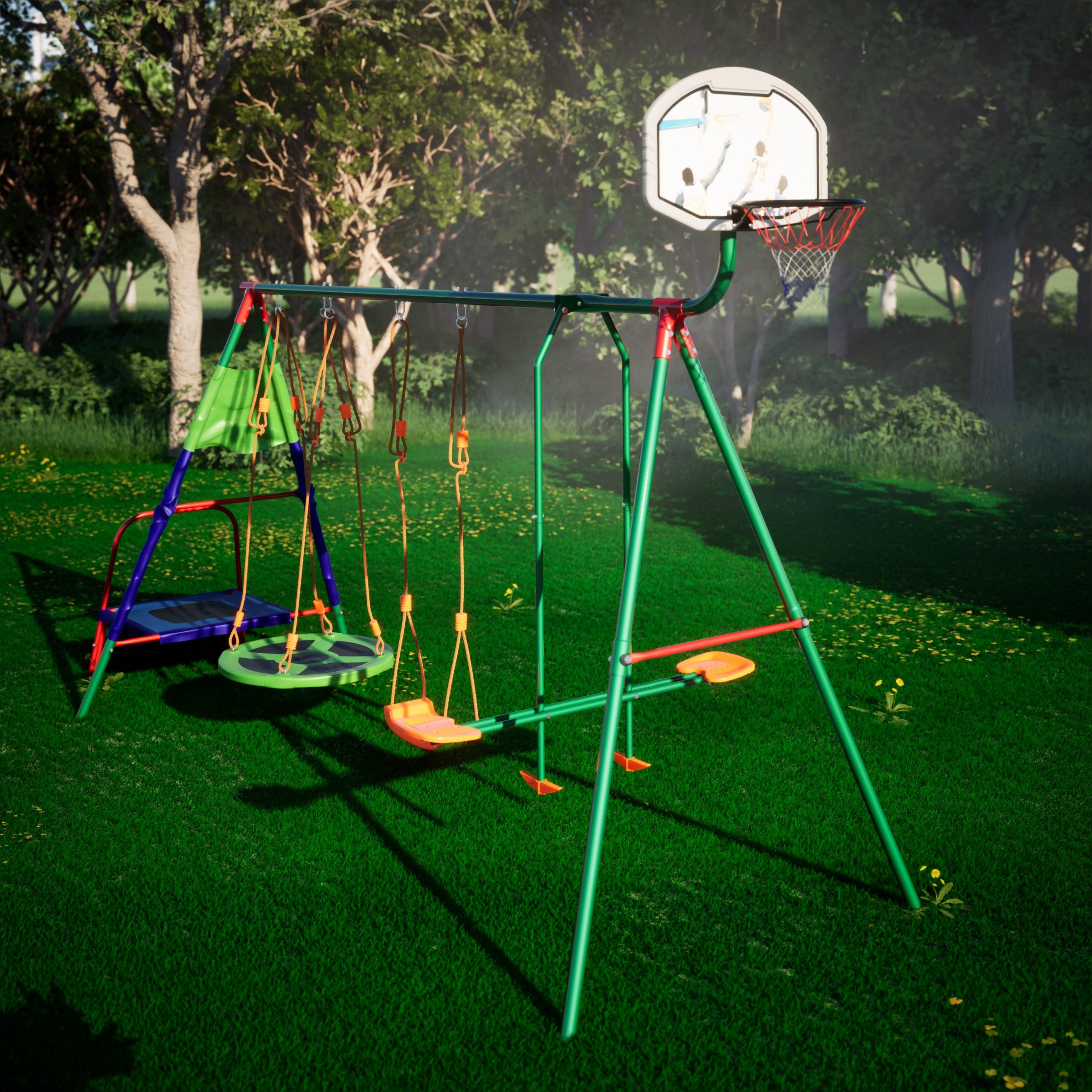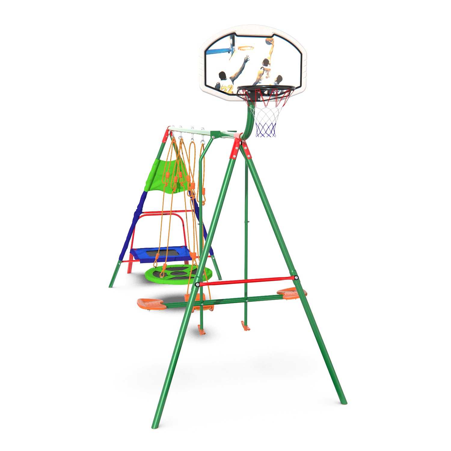 Комплектация качелей поражает воображение — комплекс оборудован не только развлекательными, но и спортивными элементами: баскетбольное кольцо, качели-планер, качели-гнездо, классические веревочные качели и батут, изготовленный из гипоаллергенных полимерных материалов. Занимает все это относительно мало места — габариты комплекса составляют 381 х 156 х 261 см.