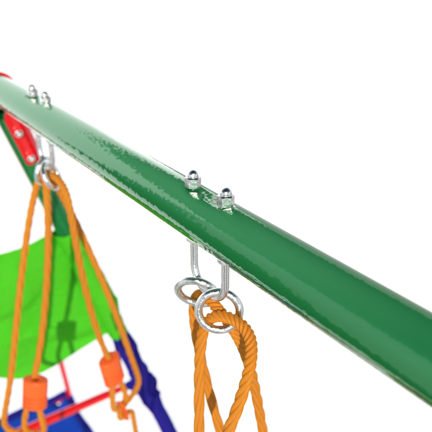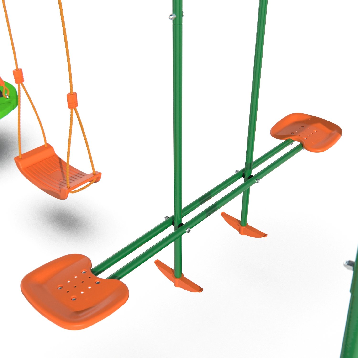 Все металлические элементы, включая профиль опоры 50,8×2 мм, выдерживающий нагрузку до 145 кг, окрашены порошковой краской, обеспечивающей устойчивость конструкции к сложным атмосферным условиям. Комплекс может использоваться детьми от 3 лет.