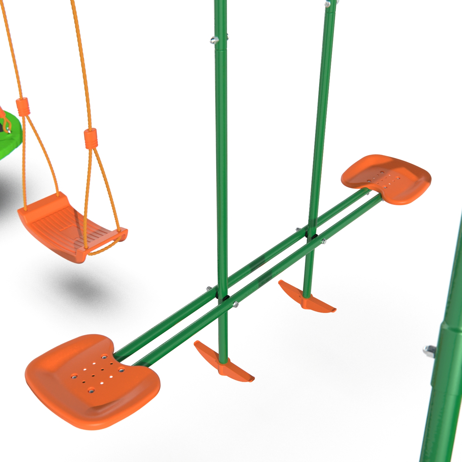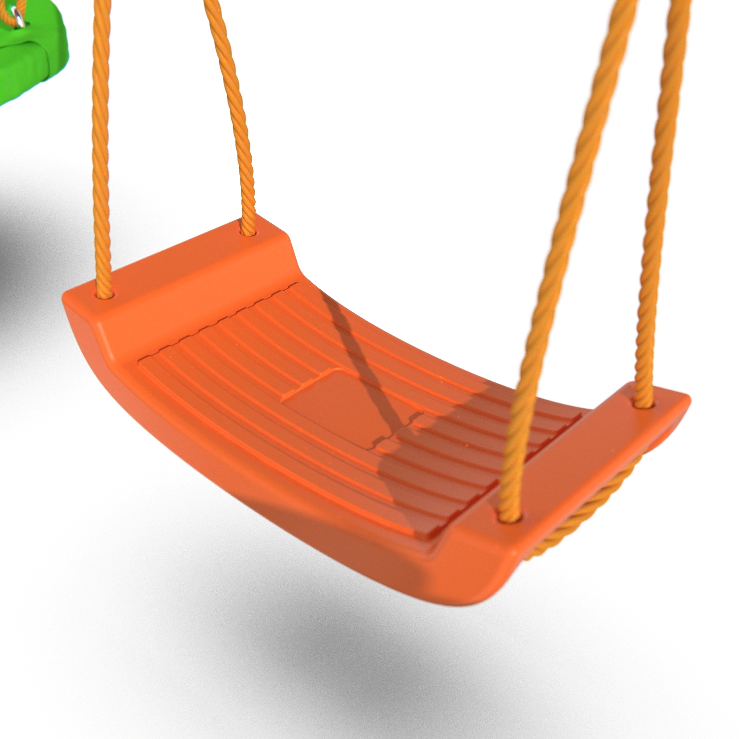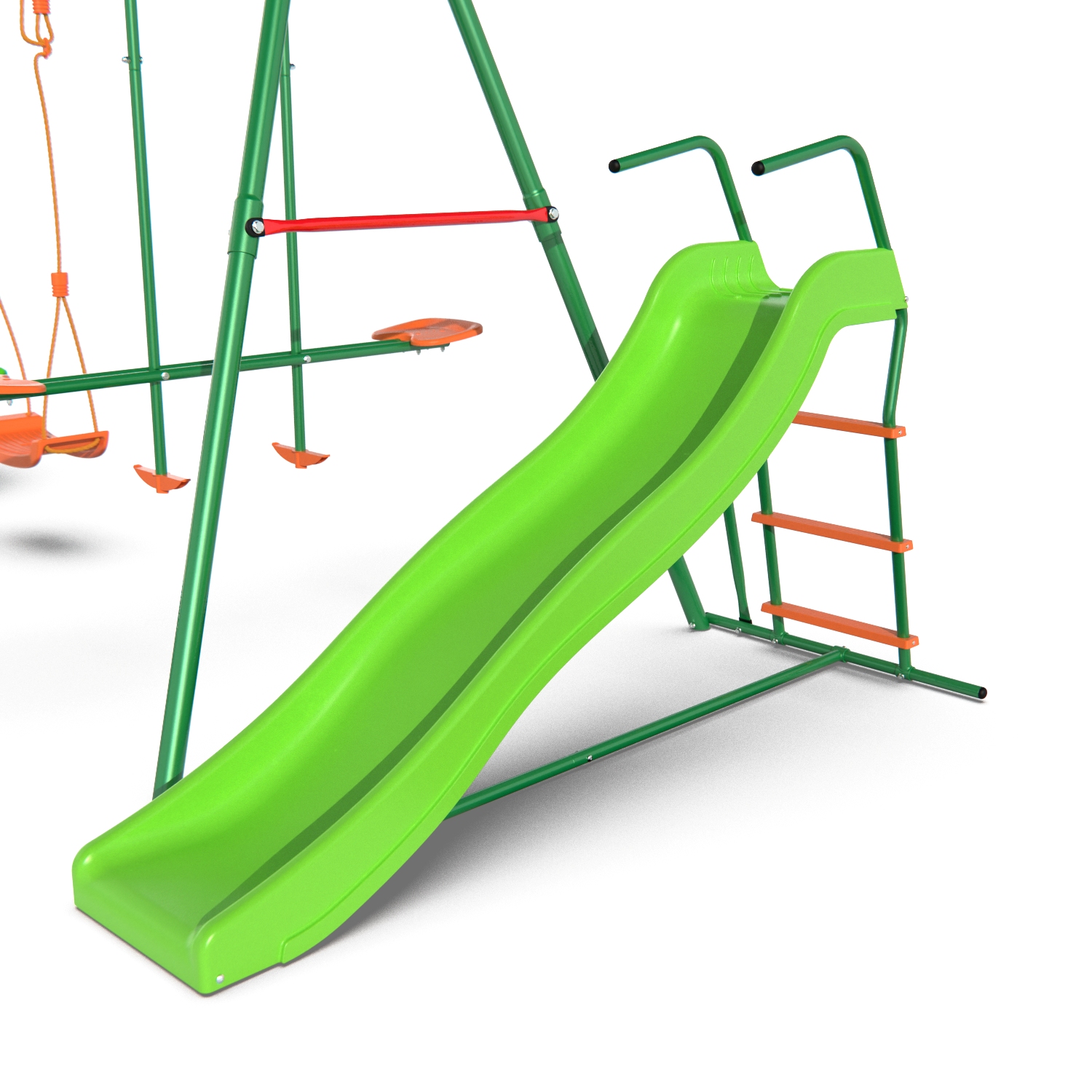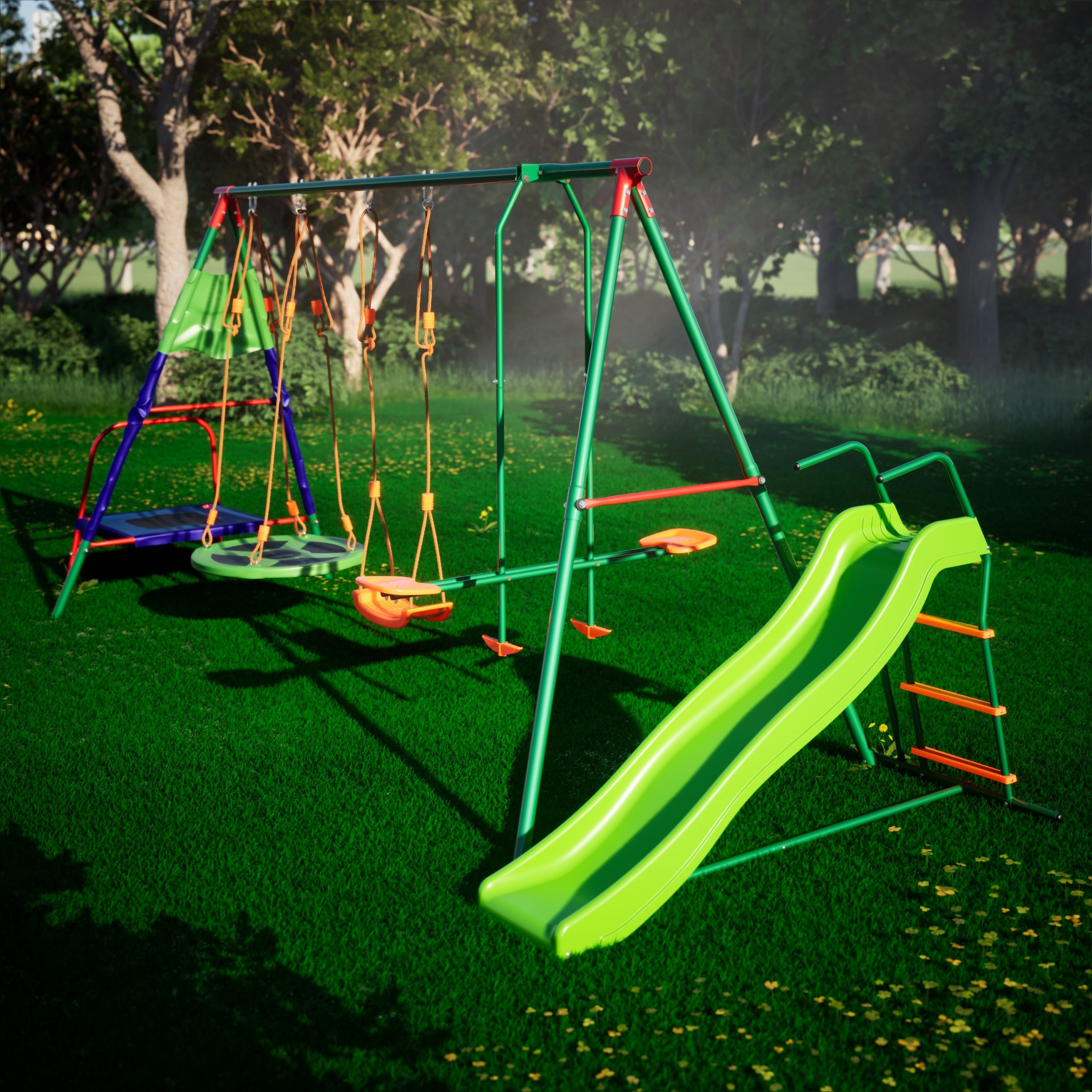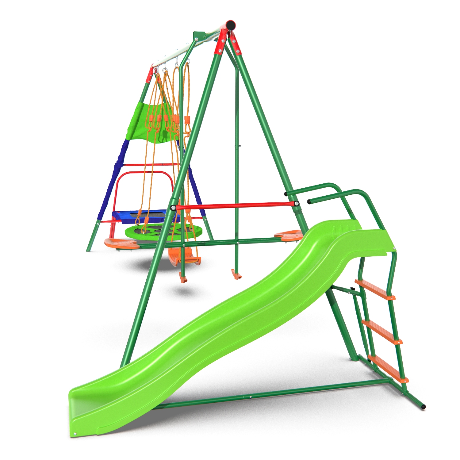 Комплекс просто огромен и представляет собой мини-парк аттракционов — его размеры составляют 437 х 188 х 196 см. В базовую комплектацию входят 3 вида качелей (классические веревочные, качели-гнездо и планер), горка из устойчивого ко всем видам воздействий ABS пластика и особенно любимый детьми батут.