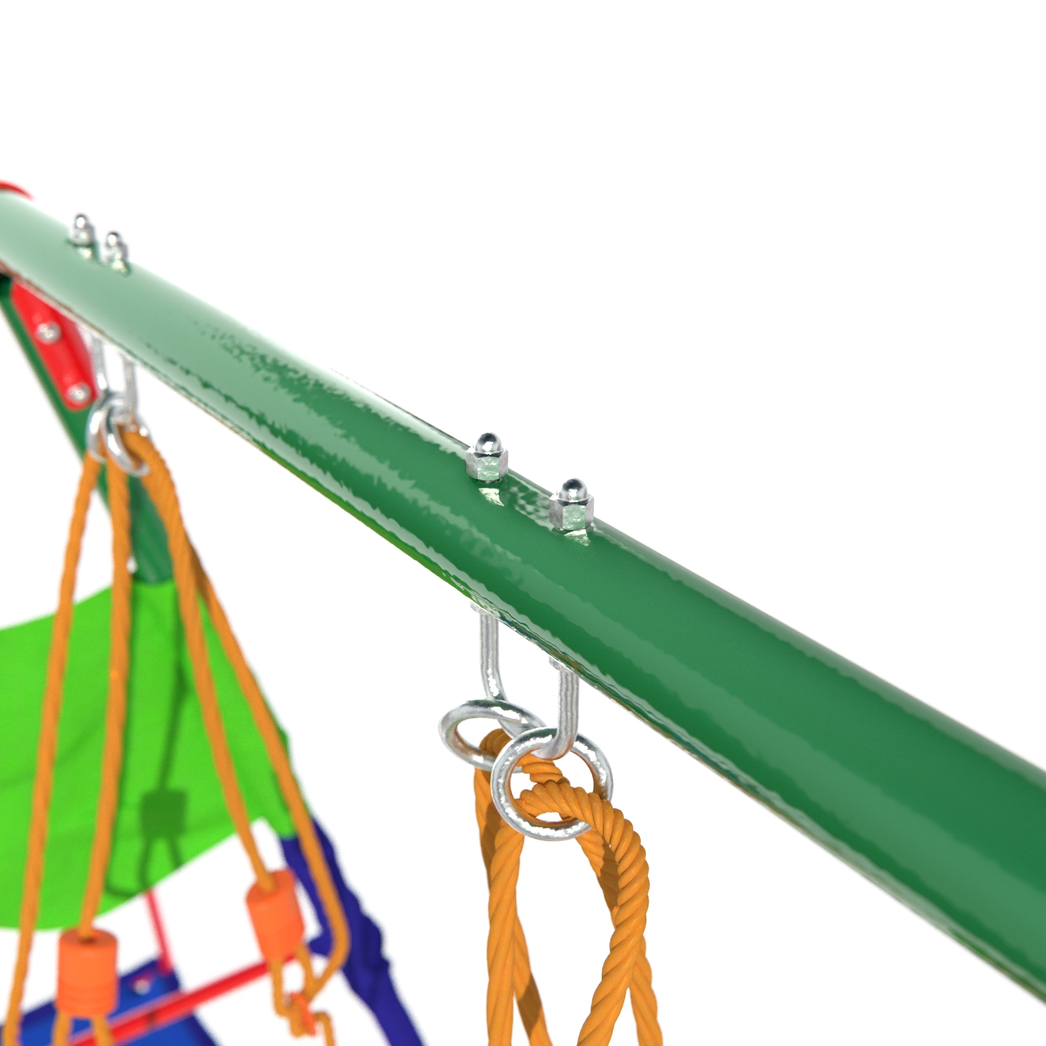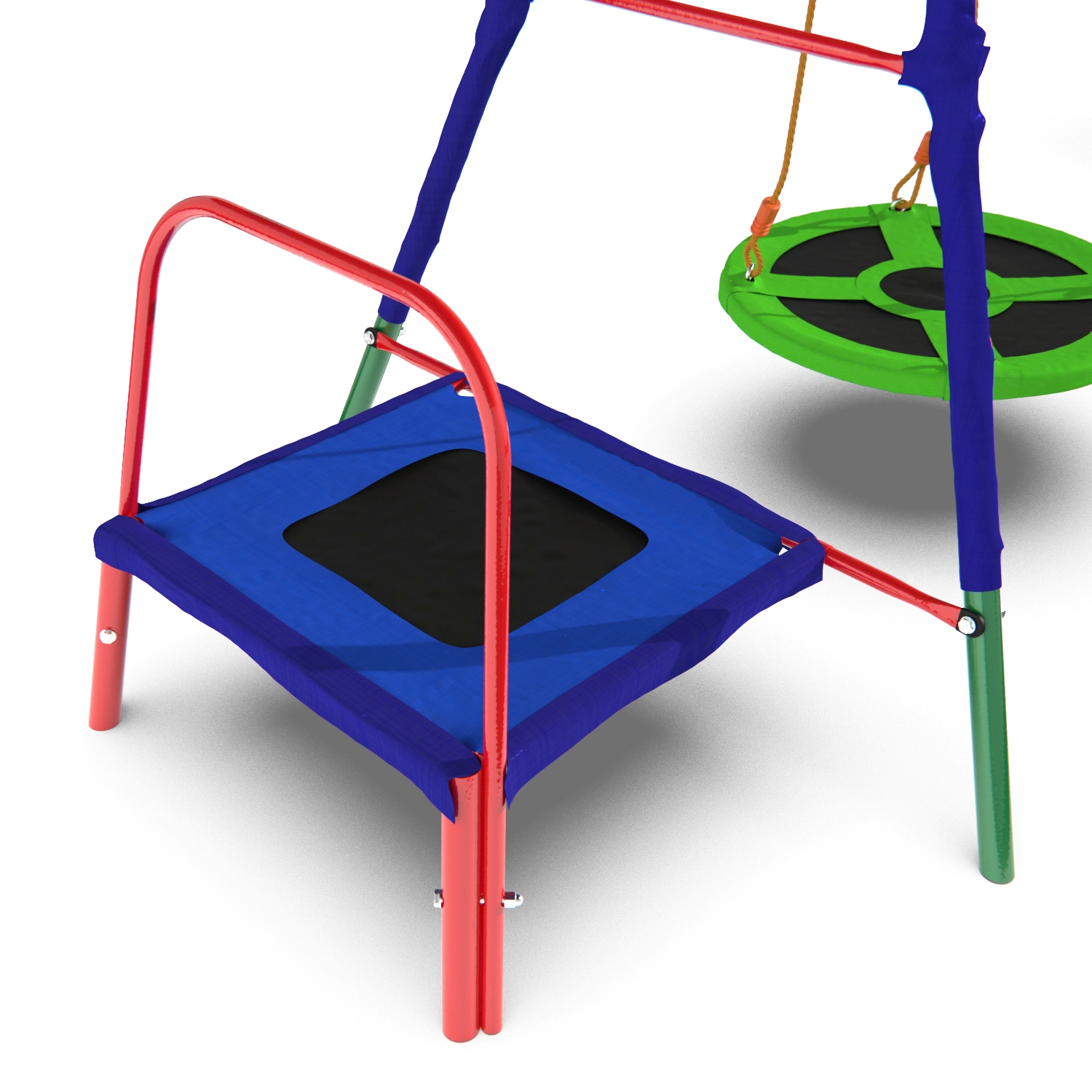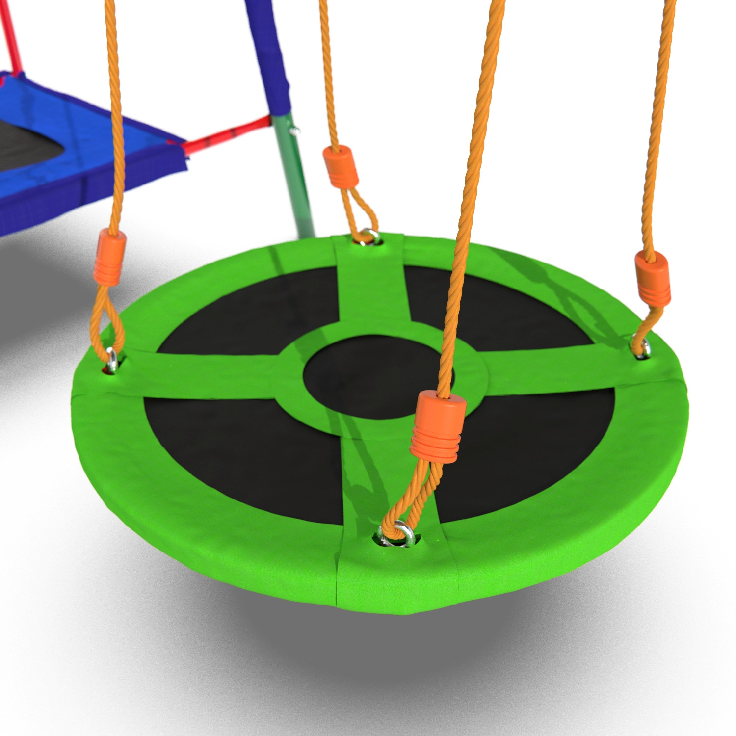 Размер батута — 86,5 х 85 х 87 см. Размер качелей-гнезда — 76 см
