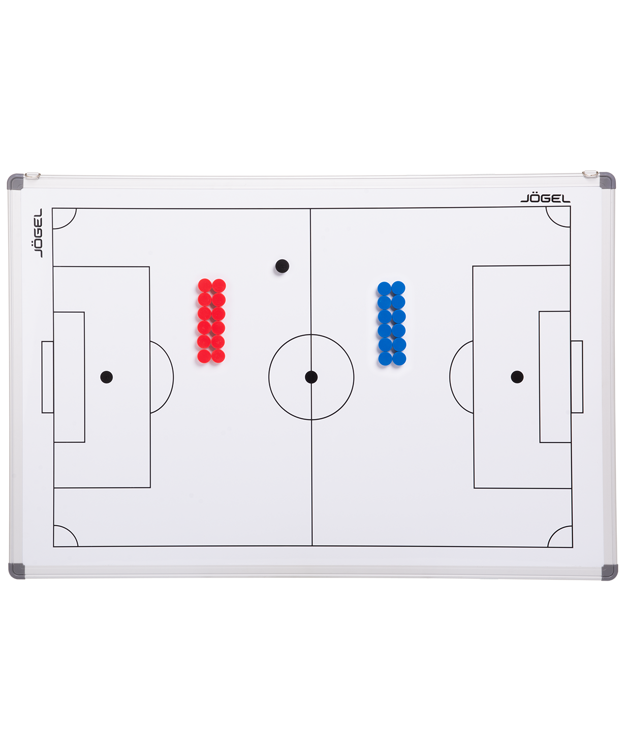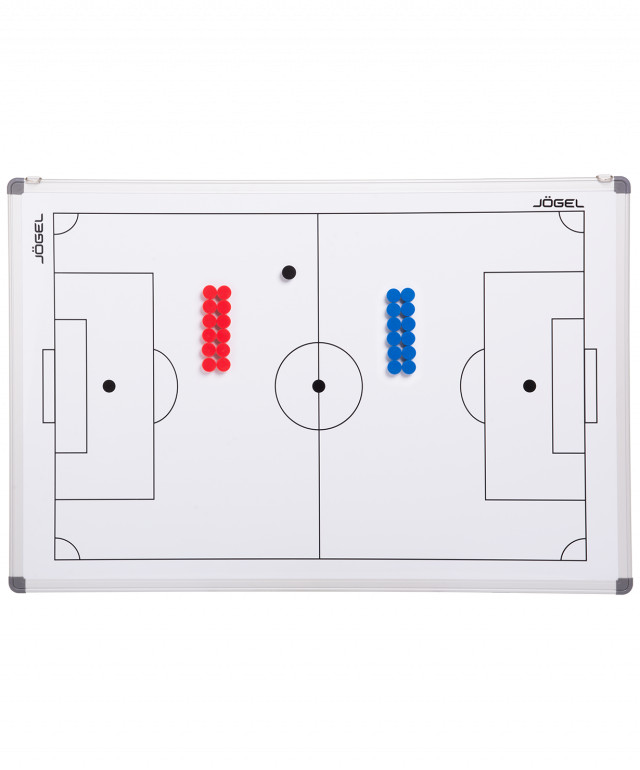 Магнитно-маркерная тактическая доска Jögel для футбола. Позволит тренеру разработать схему и тактику игры. Есть металлические петли для крепления к стене. В комплекте: пронумерованные фишки разных цветов, маркер, губка для стирания.