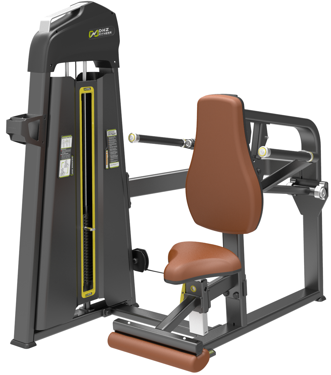 Тренажер предназначен для выполнения упражнения на развитие широчайших мышц спины, трицепса и мышц грудной клетки. Выполняемое движение: жим вниз, естественная имитация рабочих движений при отжимании на брусьях.