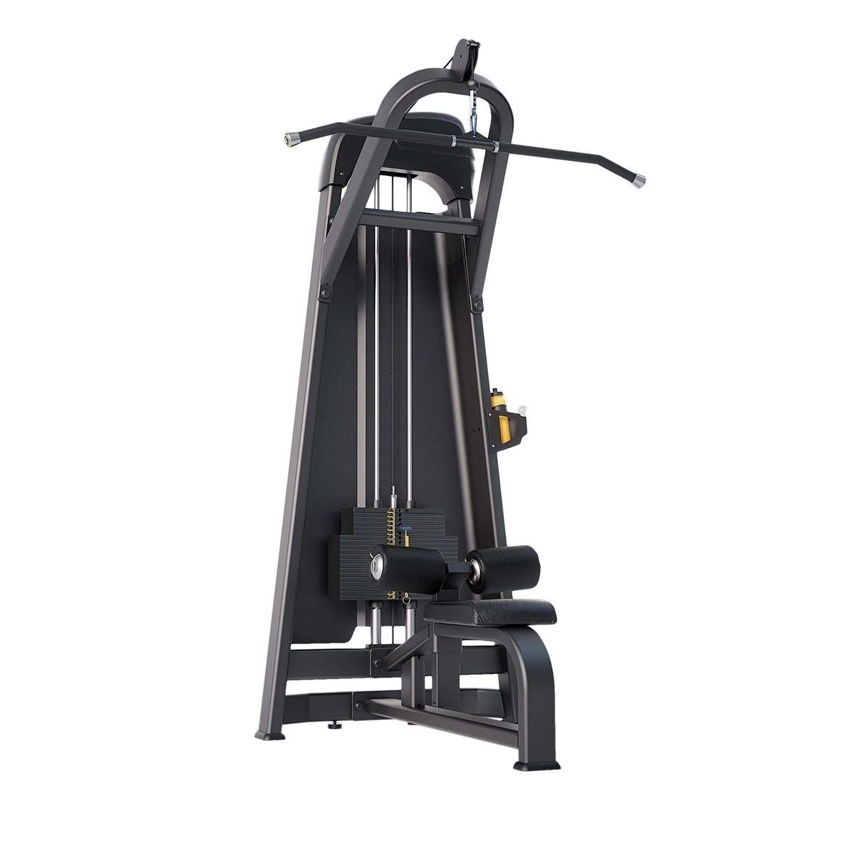 Силовой тренажер «E-1035В Тяга сверху. Вертикальный блок» соответствует всем требованиям профессионального оборудования. Конструктивные элементы рамы изготовлены из высококачественной стали, покрыты износостойкой двухслойной полимерной краской. Толщина профиля 3 мм имеет большой радиус угла, что придает тренажеру более элегантный внешний вид. Резиновые подпятники обеспечивают устойчивость и предотвращают повреждение полового покрытия в помещении. Для приведения грузоблока в движение используется трос диаметром 5,8 мм. Сиденье и валики выполнены из вспененного PU, обивка из высококачественной искусственной кожи.