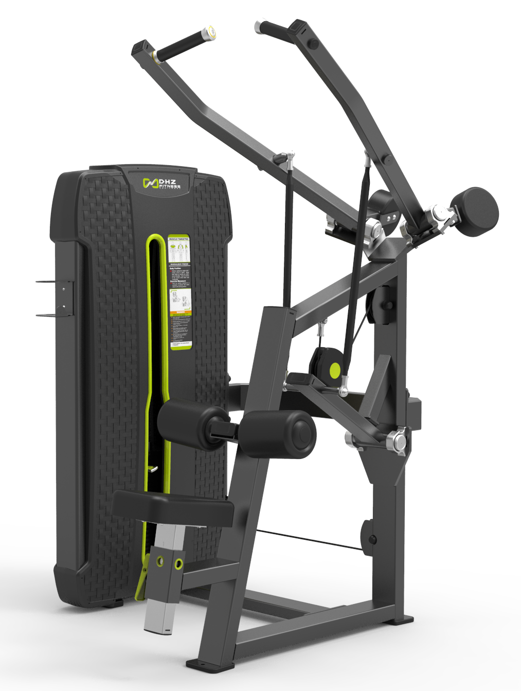 Тренажер из сверхпрочной стали создан для проработки мышц плечевого пояса. Особая конструкция позволяет спортсмену одинаково эффективно выполнять движения, как перед головой, так и за ней. Широкие рукоятки обеспечивают надежный хват. Возможность регулировать сидение позволяет индивидуально настраивать тренажер под потребности пользователя.