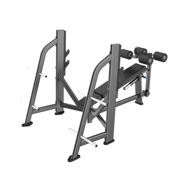 E-1041В Скамья-стойка для жима под углом вниз (Olympic Decline Bench) Тренажер служит для работы нижней частью большой грудной мышцы и передней частью дельтовидной мышцы. Наклон скамьи, покрытой мягкой обивкой, дает дополнительную нагрузку спортсмену. Специальные валики позволяют надежно зафиксировать ноги во время выполнения упражнения.